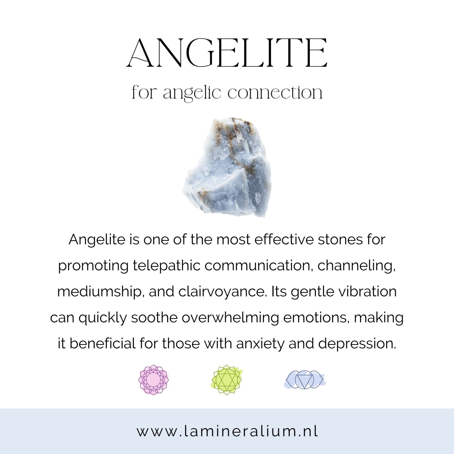 Binnen de wereld van edelstenen wordt angeliet traditioneel geassocieerd met rust, zachte communicatie en innerlijke vrede.