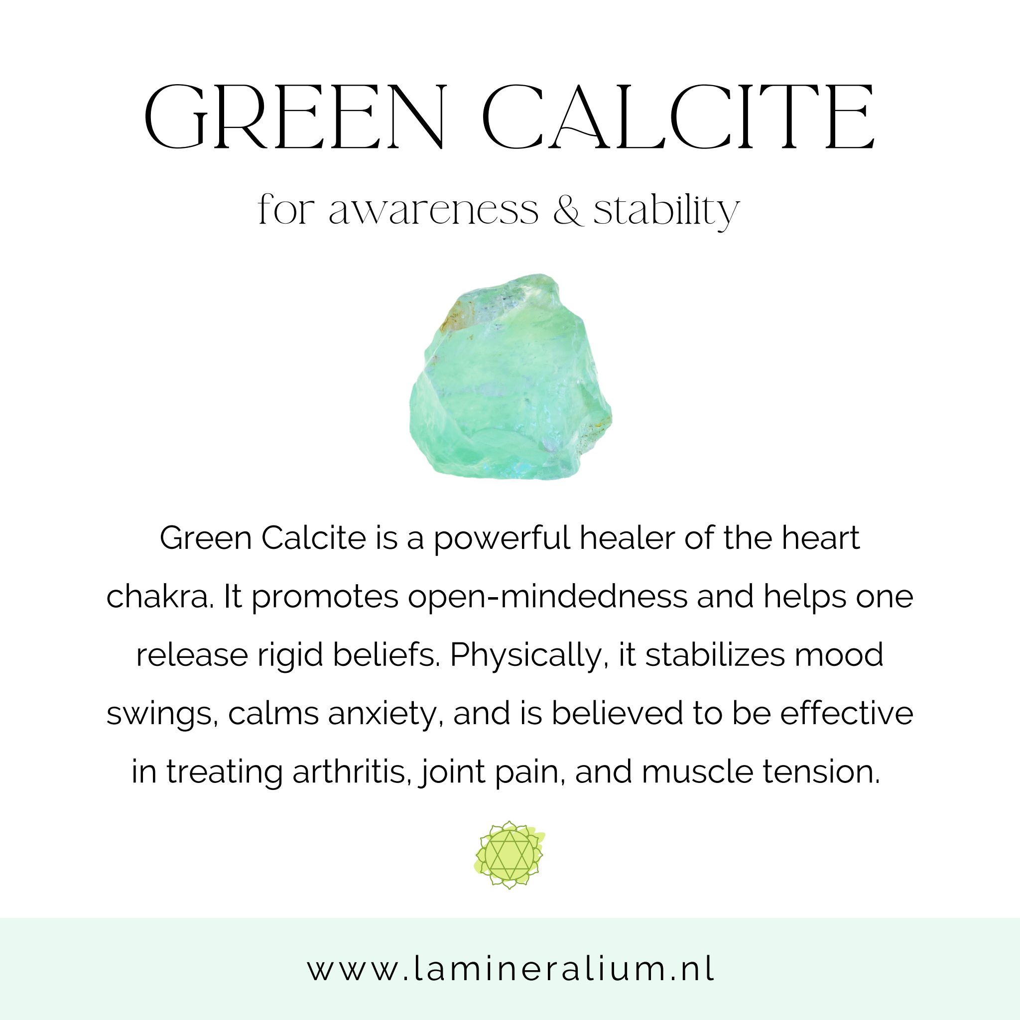 Groene Calciet wordt verbonden met balans en herstel. Deze steen ondersteunt emotionele harmonie en helpt je om je energieveld te stabiliseren.