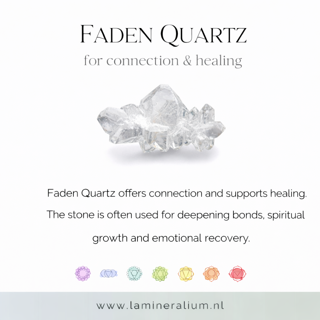 Binnen de wereld van edelstenen wordt faden kwarts vaak geassocieerd met verbinding, herstel en innerlijke groei. Haar energie wordt vaak ervaren als stabiliserend en ondersteunend.
