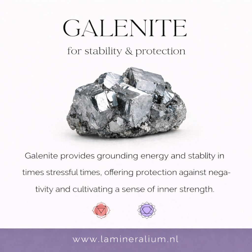 en te aarden. Haar aanwezigheid voelt vaak stevig, helder en beschermend. Galeniet helpt om weer met beide voeten op de grond te staan en brengt rust wanneer gedachten of emoties onrustig worden.