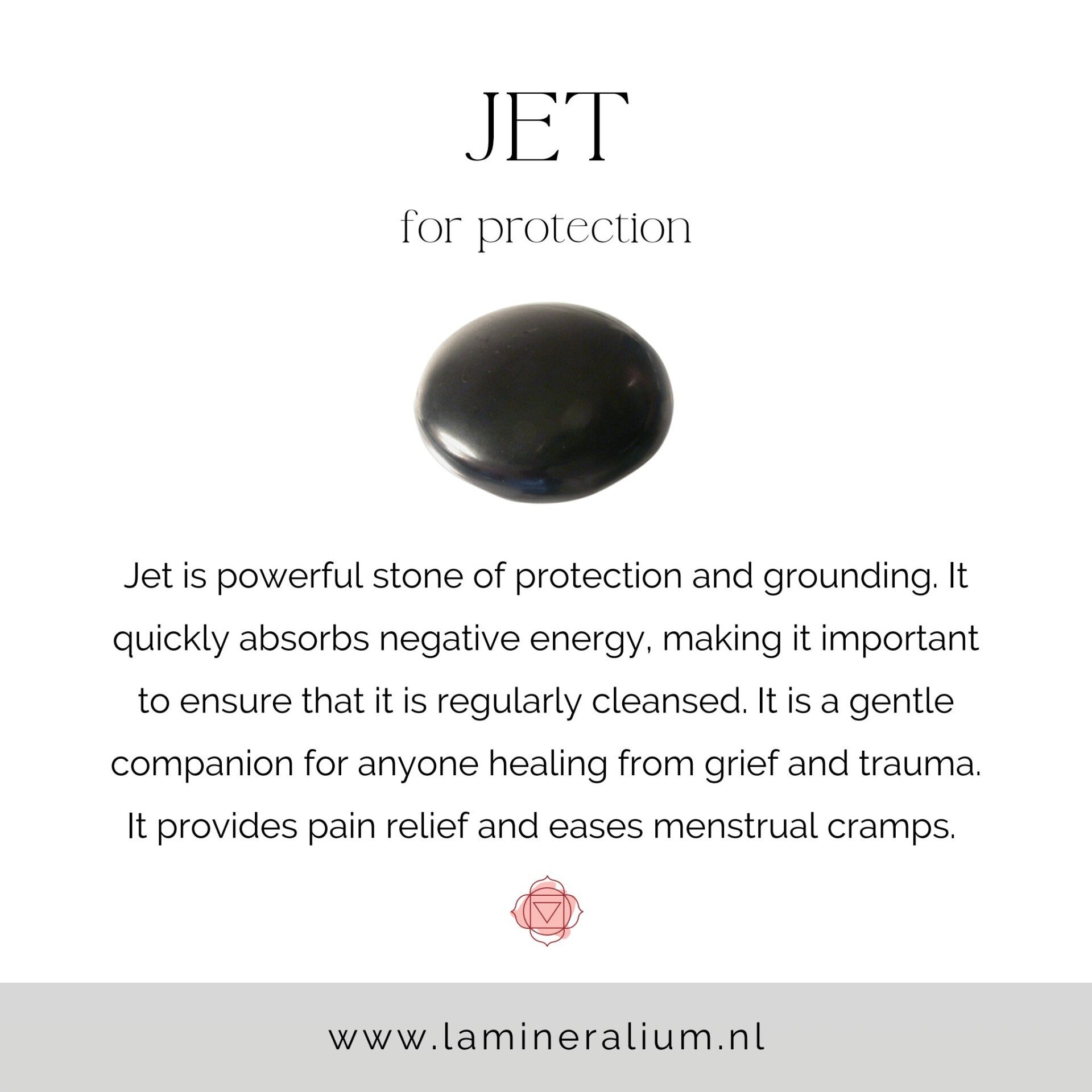 Binnen de wereld van edelstenen wordt jet vaak geassocieerd met bescherming, aarding en energetische reiniging. Haar energie wordt vaak ervaren als stabiliserend en beschermend.
