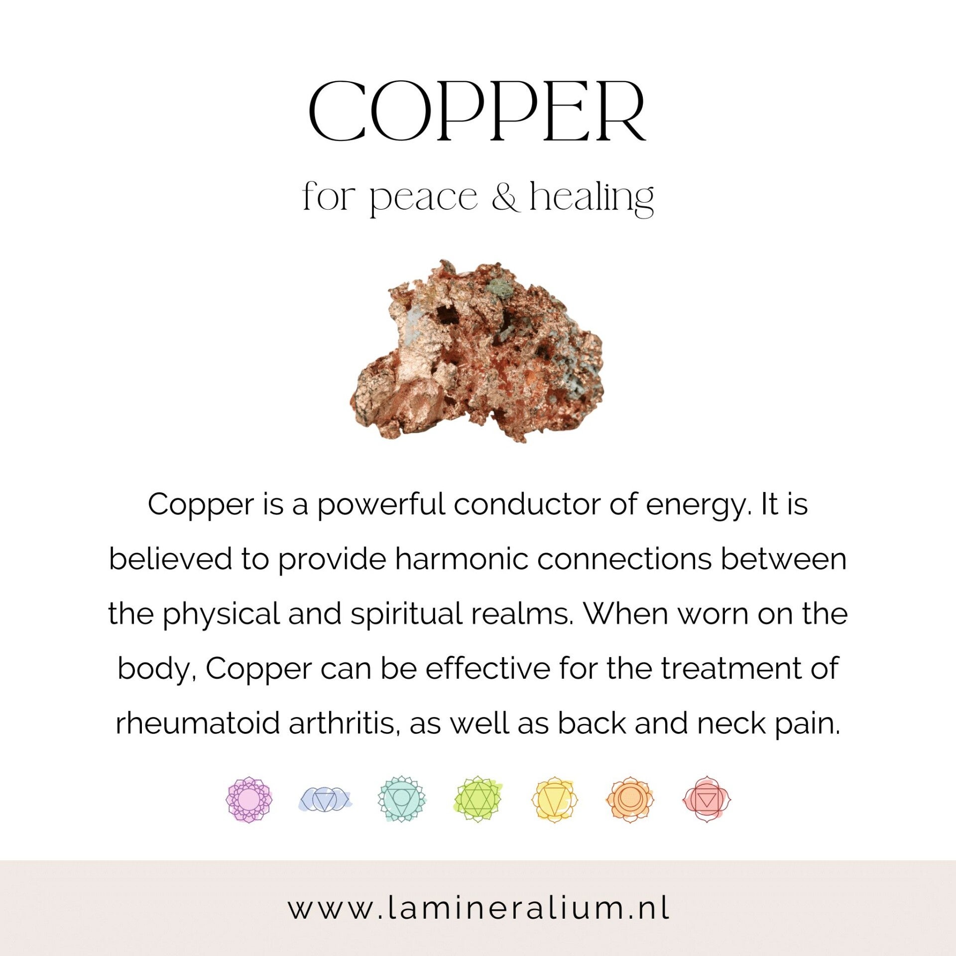 Binnen de wereld van edelstenen en metalen wordt koper vaak geassocieerd met energie, balans en verbinding. Haar energie wordt