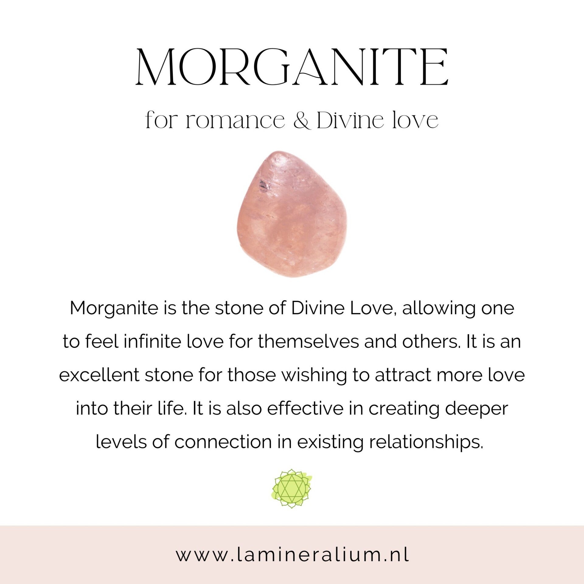 Morganiet is een zachte, liefdevolle steen die vaak wordt geassocieerd met het hart. Haar zachte roze tinten dragen een energie van compassie, zachtheid en emotionele heling.