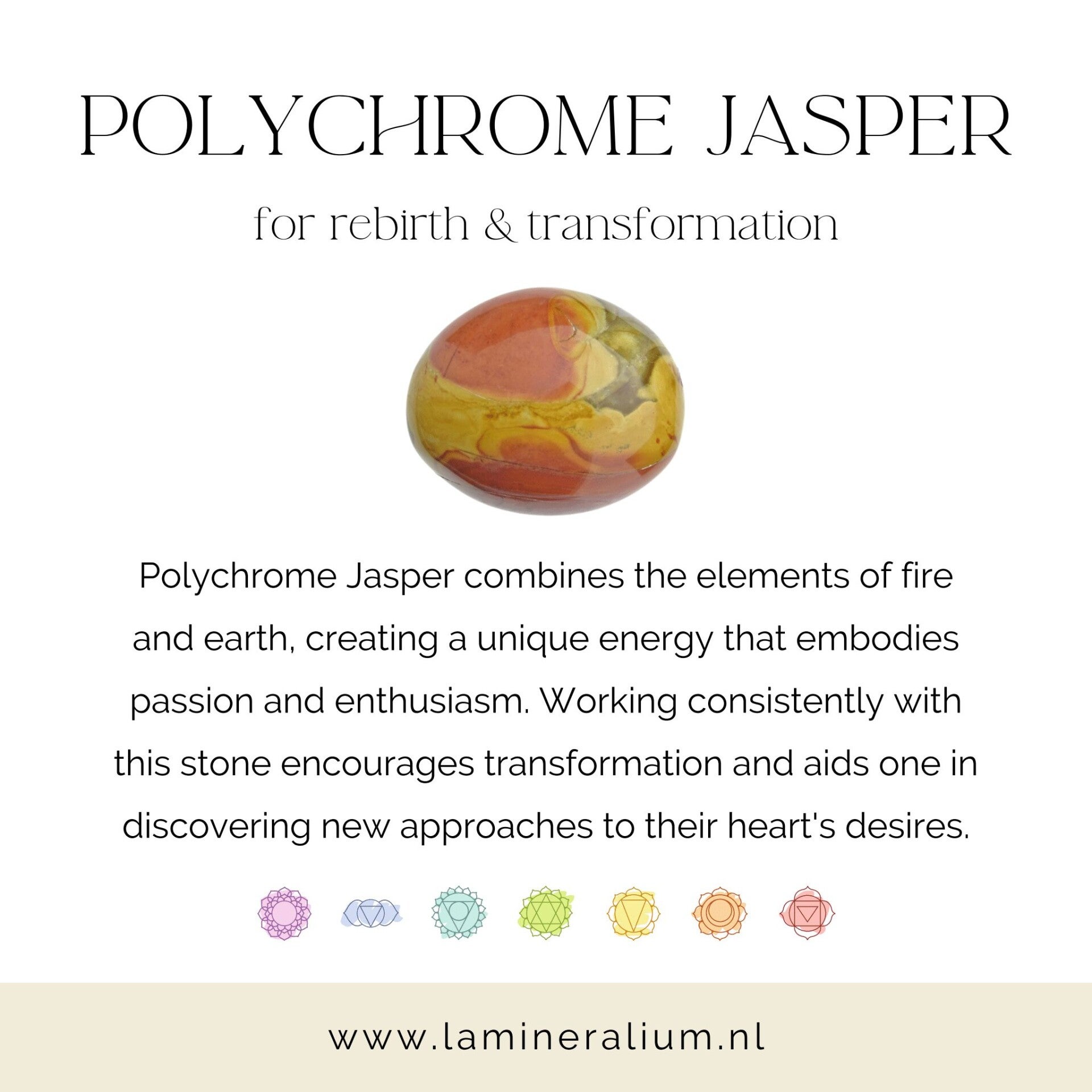 Polychroom Jaspis wordt vaak gezien als een steen die helpt om levensenergie en enthousiasme te versterken.