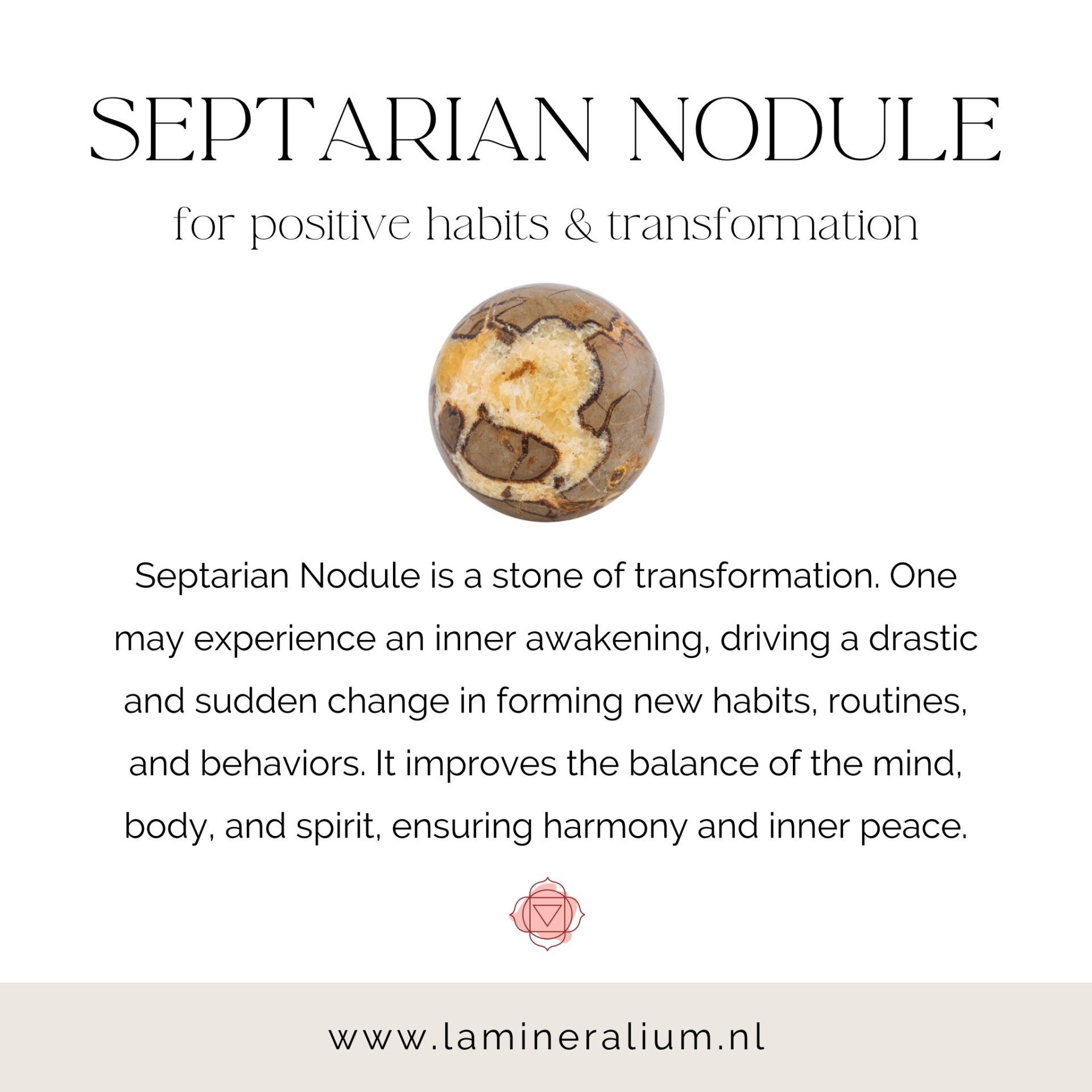 Binnen de wereld van edelstenen wordt septarie traditioneel geassocieerd met aarding, stabiliteit en innerlijke kracht.