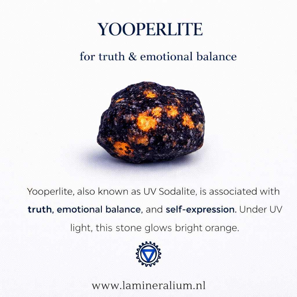 Yooperliet is een bijzondere steen die vooral bekend staat om haar opvallende fluorescentie. Onder normaal licht lijkt het gesteente vaak grijs of donker van kleur, maar onder UV-licht verschijnen heldere oranje tot gele patronen die als kleine lichtvlekken oplichten.