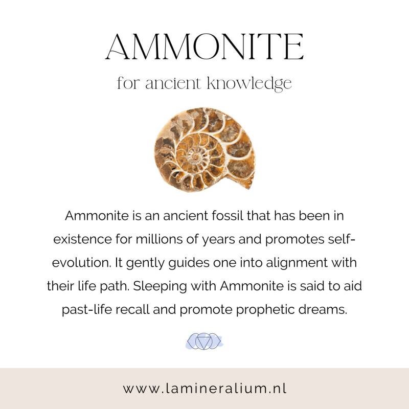 Ammoniet staat bekend om haar aardende en beschermende energie en ondersteunt persoonlijke transformatie, stabiliteit en verbinding met de natuurlijke stroom van het leven.