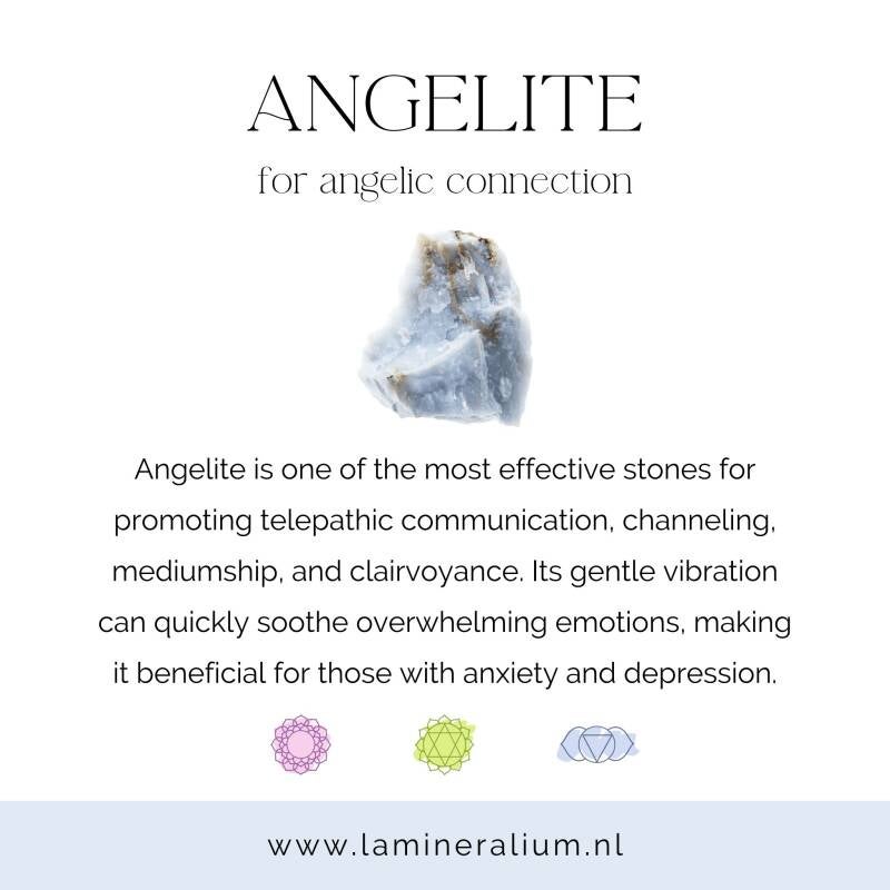 Angeliet staat bekend om haar kalmerende en troostende energie en ondersteunt innerlijke rust, intuïtieve verbinding en een diep gevoel van vrede en vertrouwen.