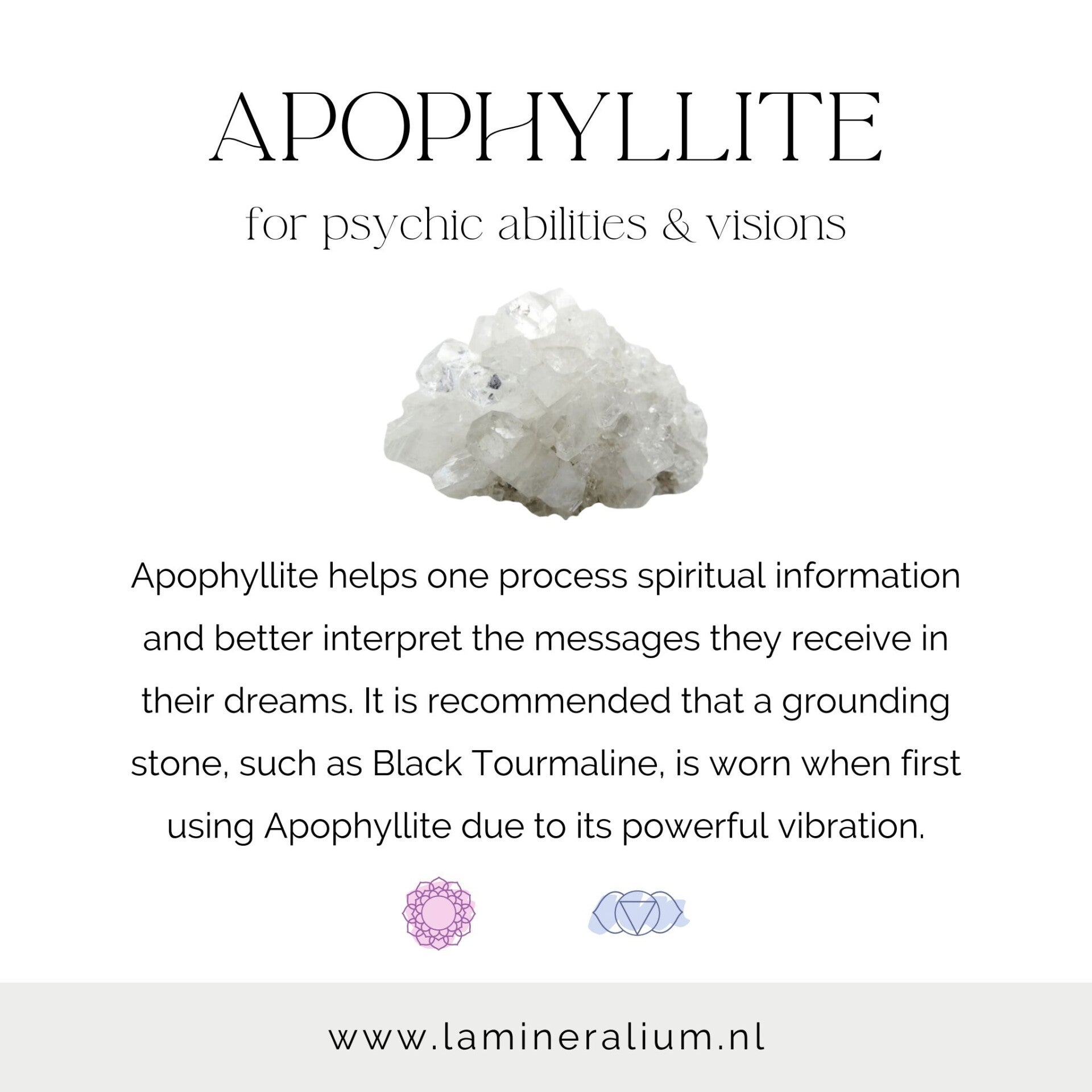 Apofyliet staat bekend om haar zuiverende en inzichtgevende energie en ondersteunt spirituele groei, intuïtie en een heldere verbinding met je innerlijke waarheid.