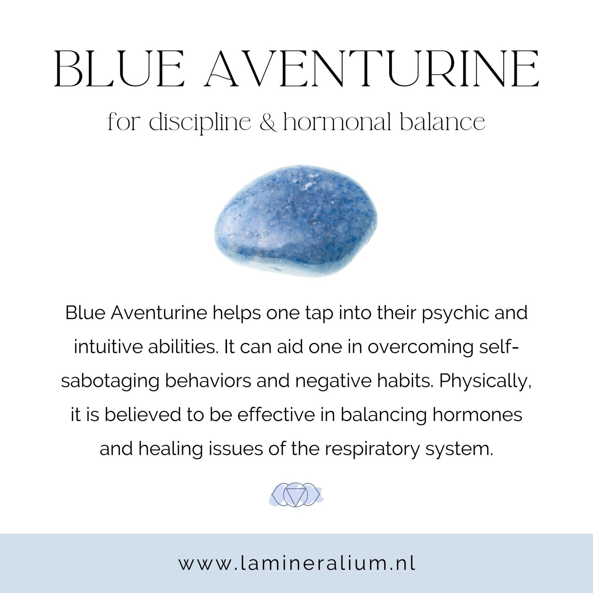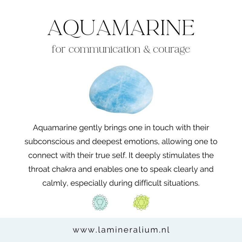 Aquamarijn staat bekend om haar kalmerende en beschermende energie en ondersteunt emotioneel evenwicht, zelfexpressie en innerlijke vrede.