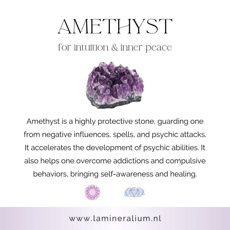 Amethist staat symbool voor innerlijke rust, helderheid en bescherming. De steen helpt je om je gedachten te kalmeren en versterkt