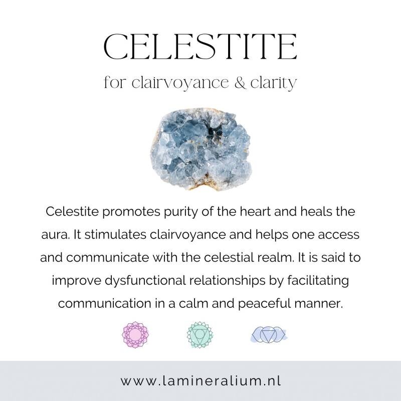 "Celestien symboliseert rust, helderheid en spirituele verbinding. De steen helpt je om spanning los te laten en ondersteunt je in het ervaren van een diepe staat van innerlijke kalmte.