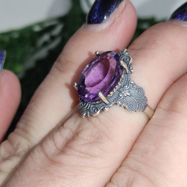 Prachtige dieppaarse ring van facetgeslepen Amethist. Gezet in S925 Zilveren ring welke een halve tot driekwart maat groter of kleiner versteld kan worden. Standaard heeft ze maat 18,5.
