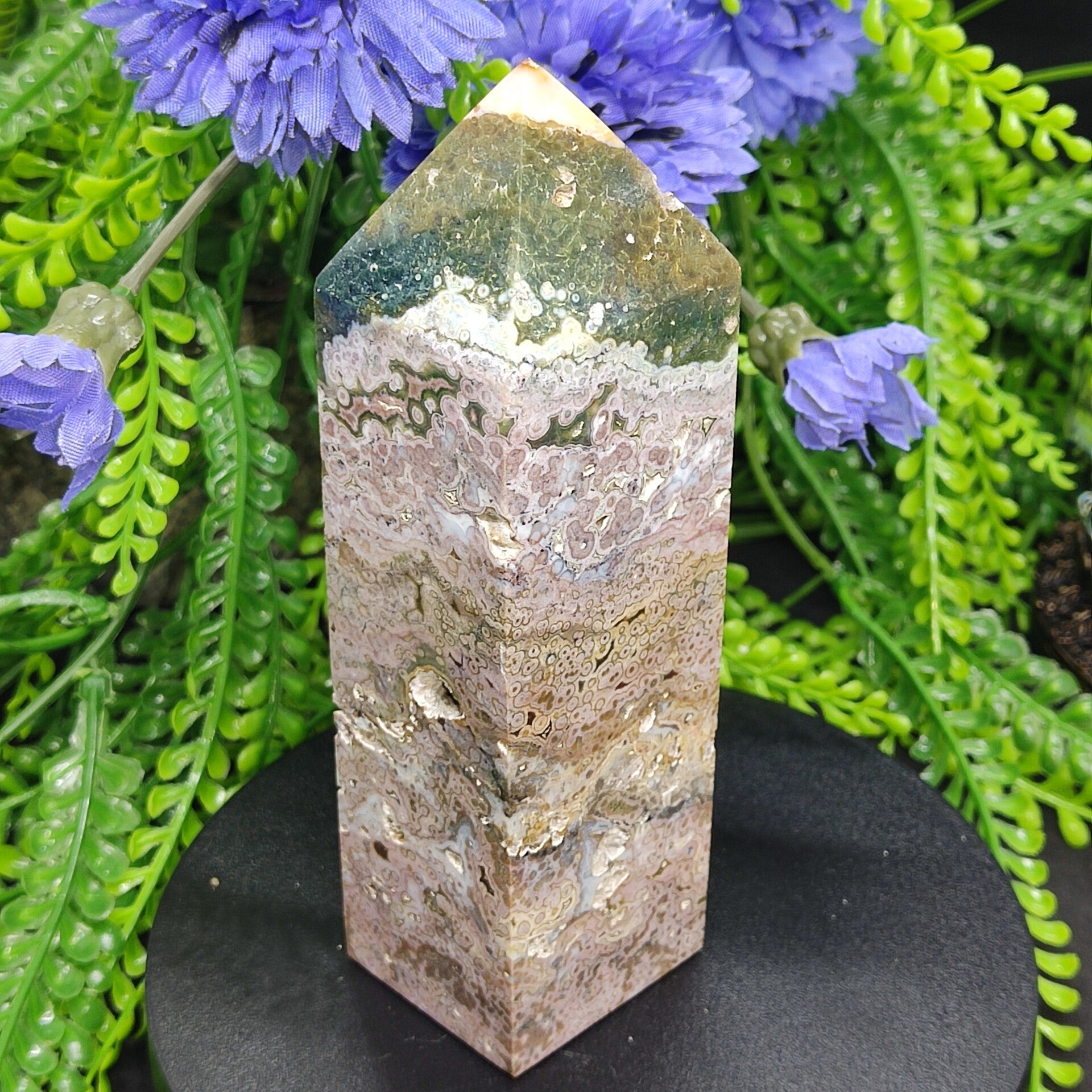 Deze mooie geslepen punt van oceaanjaspis met prachtig patroon in roze, paarse en groene combinatie is 14 centimeter groot en weegt 476 gram.
