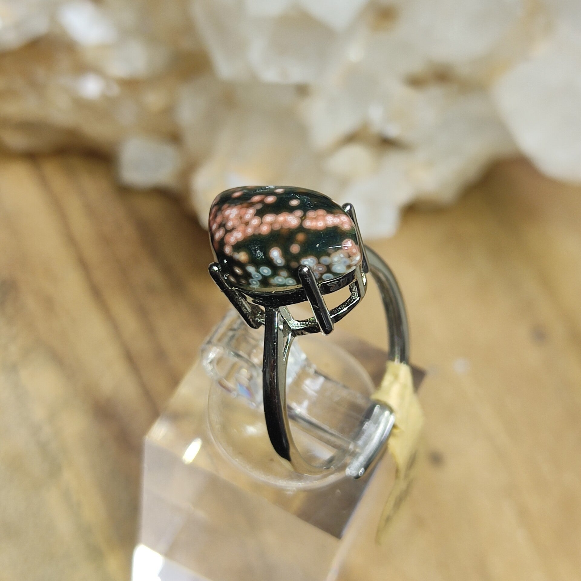 Prachtige ring van zilver met steen van orbicuculaire oceaanjaspis (De typische rondjes). De ring is verstelbaar van maat 16,5 tot maat 17,5.