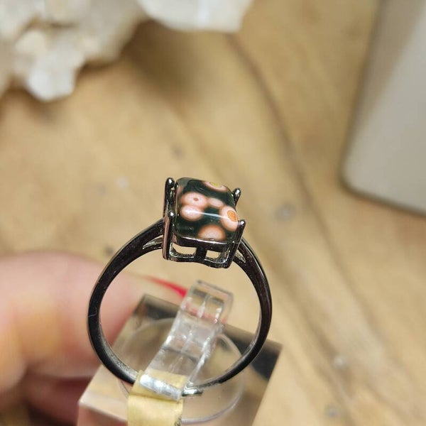 Prachtige ring van zilver met steen van orbicuculaire oceaanjaspis (De typische rondjes). De ring is verstelbaar van maat 16 tot maat 17,5.