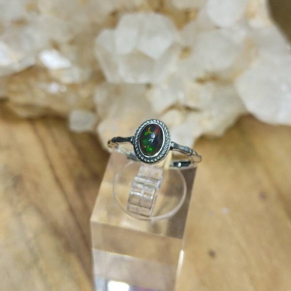 En kijk nou, dat kan toch ook niet anders? Prachtige kleurschakeringen in deze ring van donkere Welo Opaal.