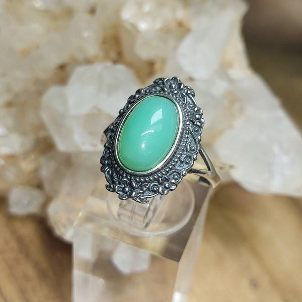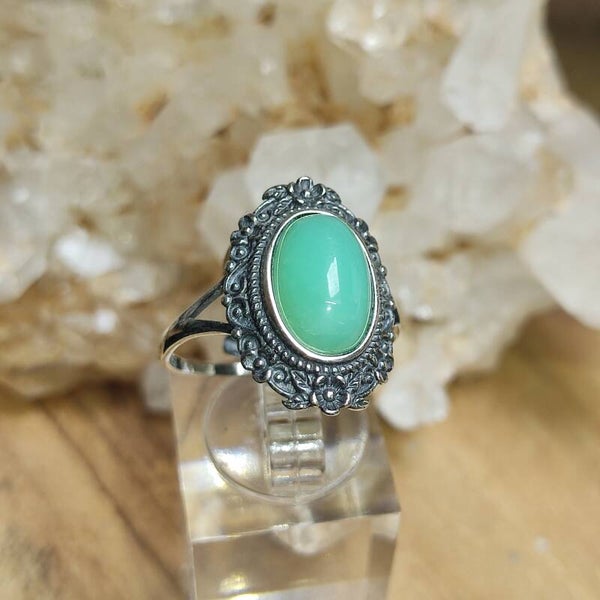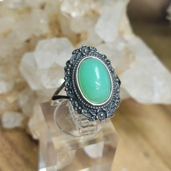 Chrysopraas werkt tegen onrust, hartkrampen en bloedingen. Ze verhoogt de helderheid, je aanpassingsvermogen en maakt vergingsgezind. Ook stimuleert ze geestelijke groei.