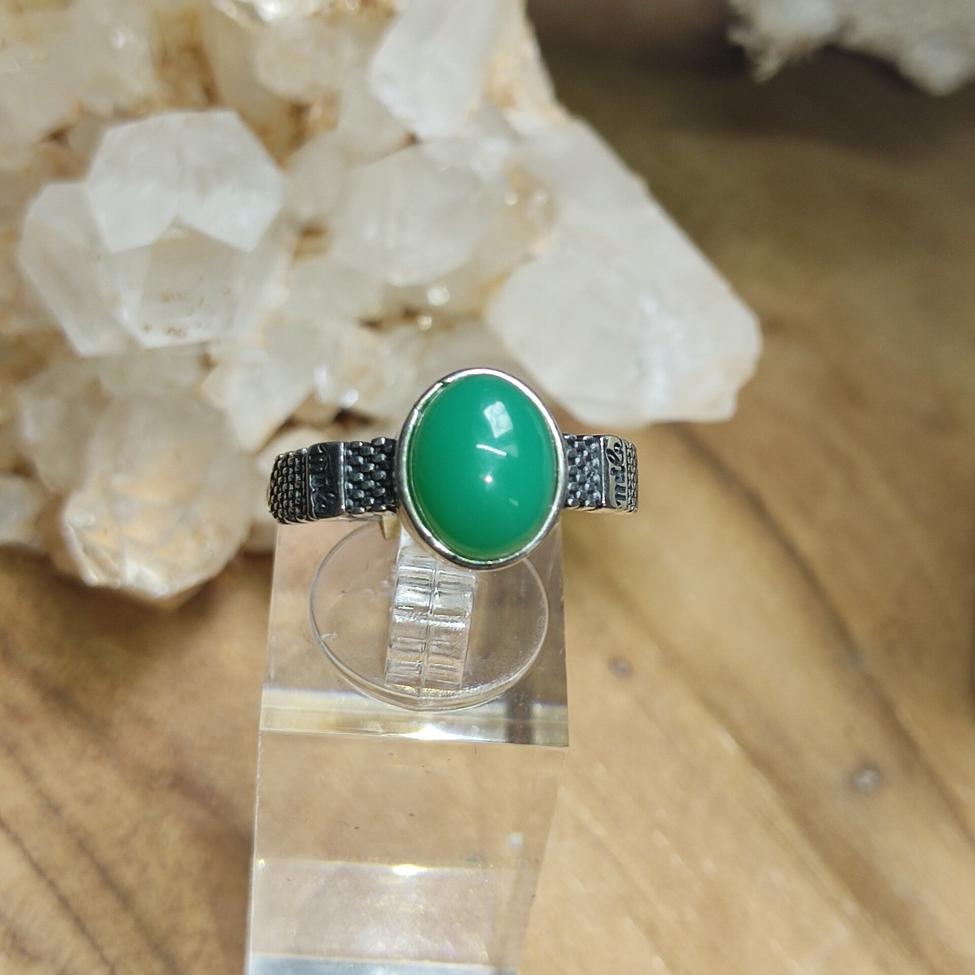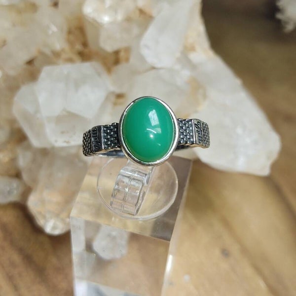 Chrysopraas werkt tegen onrust, hartkrampen en bloedingen. Ze verhoogt de helderheid, je aanpassingsvermogen en maakt vergingsgezind. Ook stimuleert ze geestelijke groei.