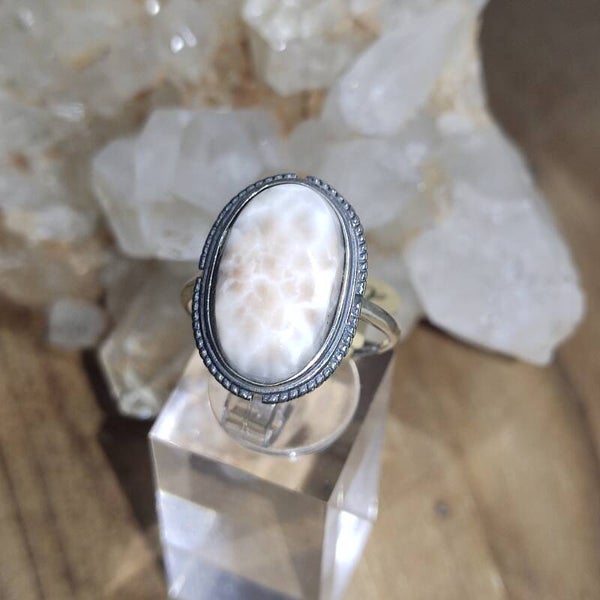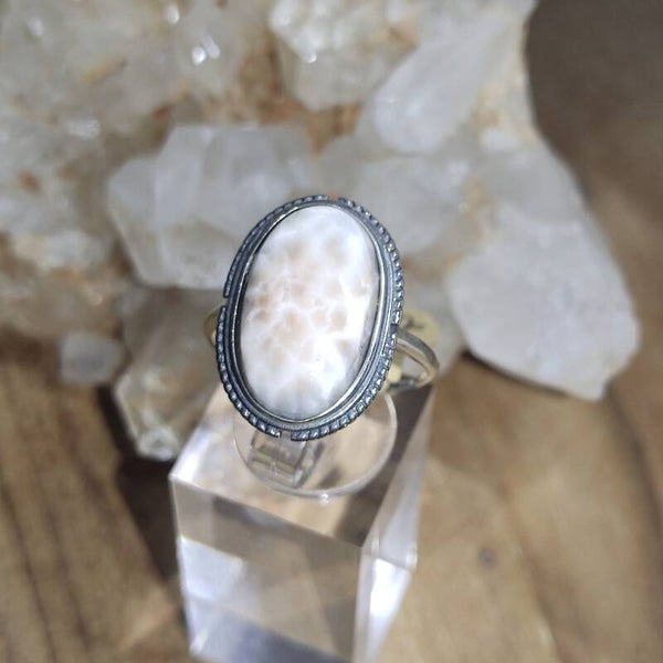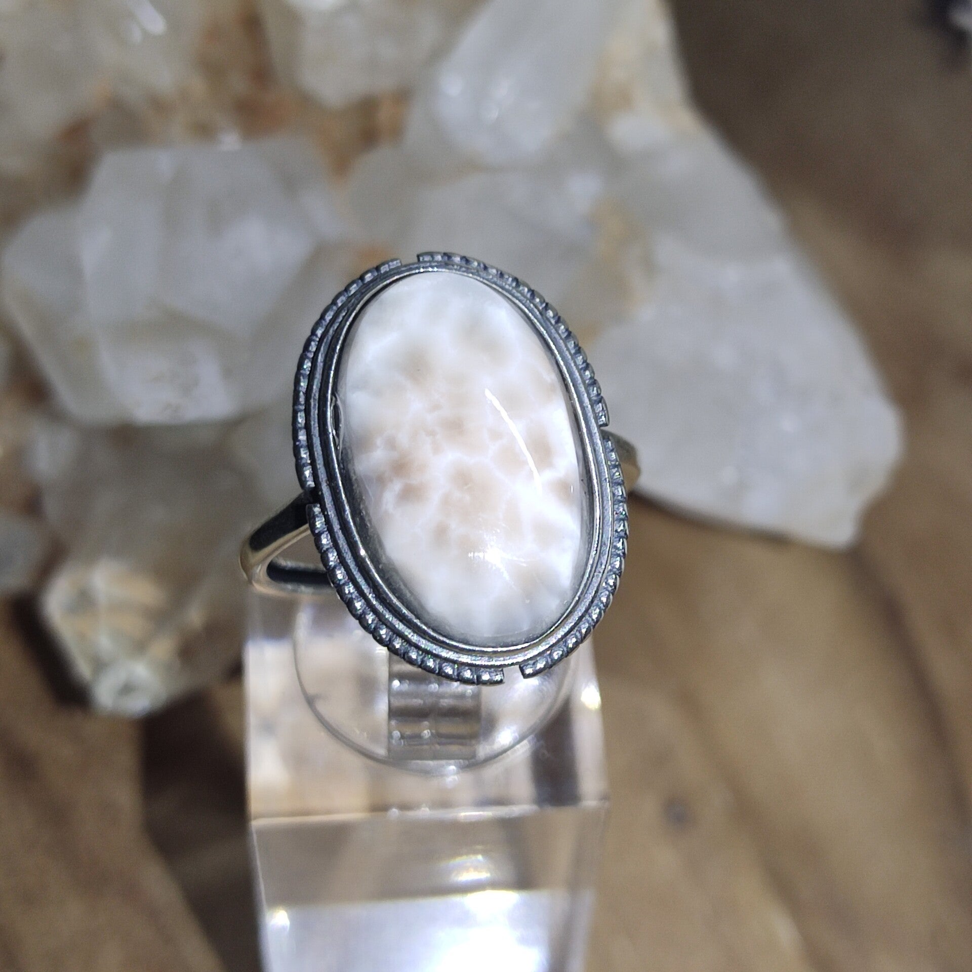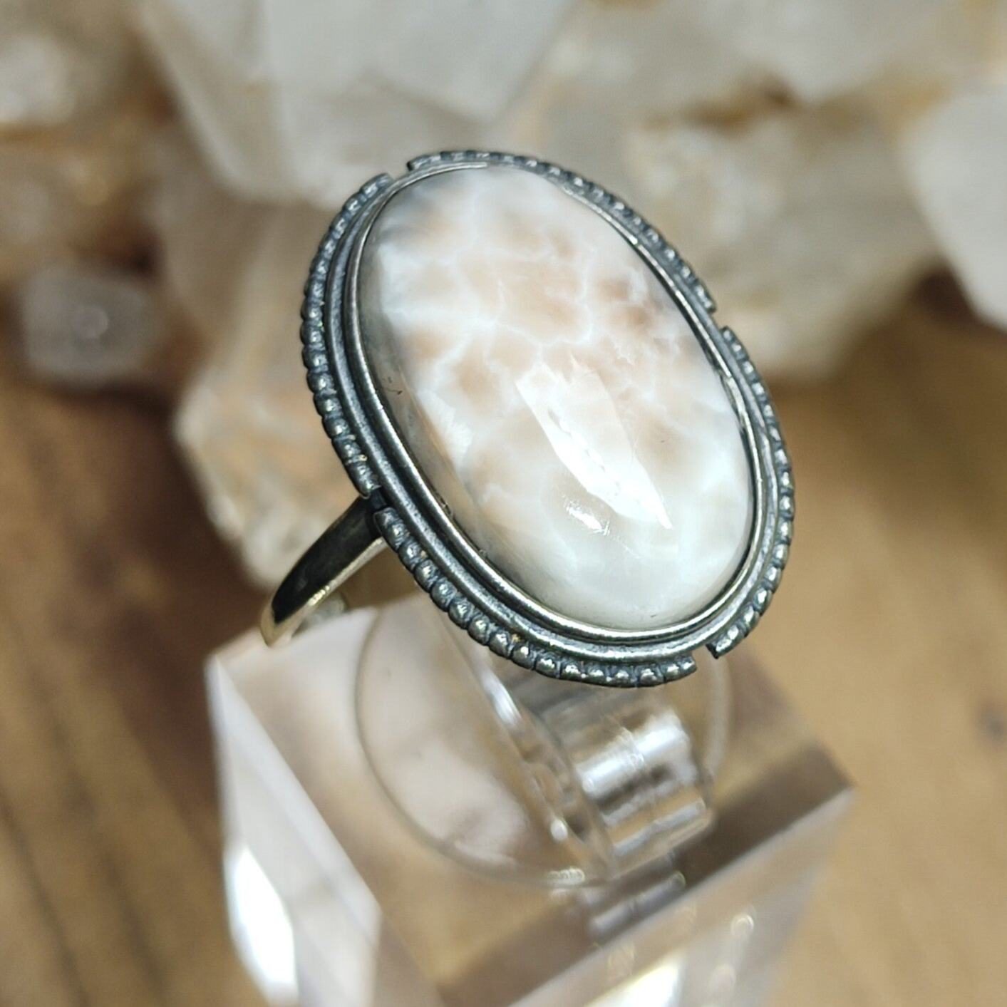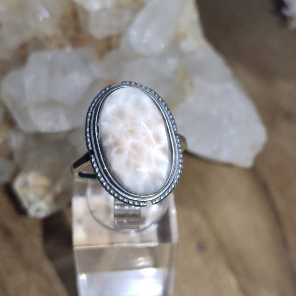 Deze mooie ring van S925 zilver met grote natroliet steen is verstelbaar en draagbaar van maat 17,5 tot maat 19.