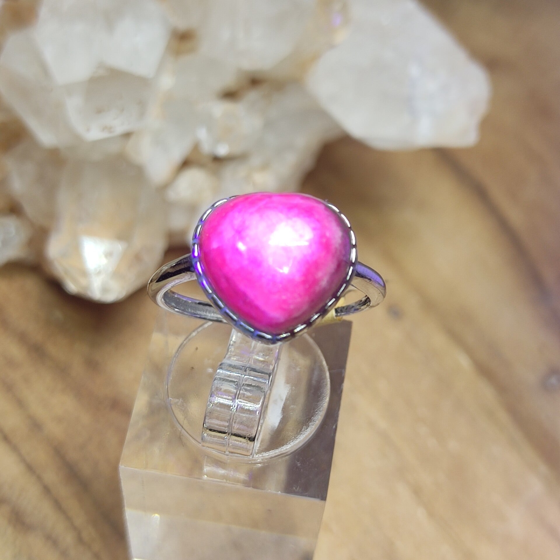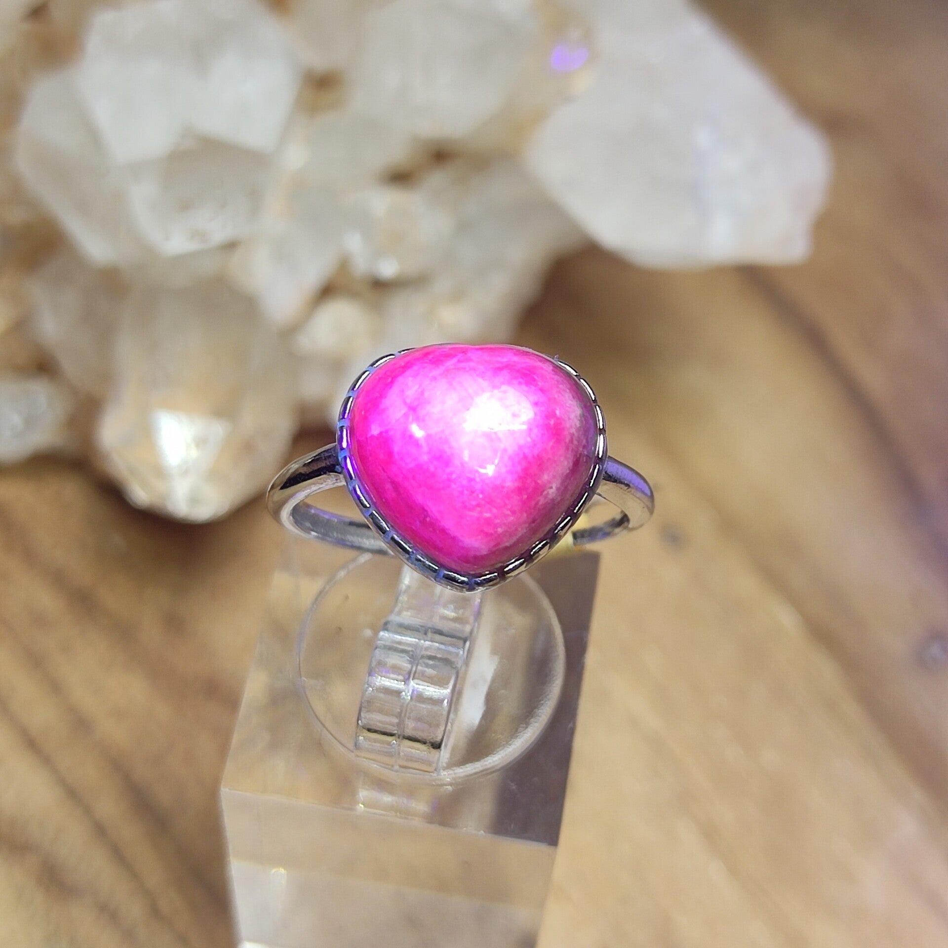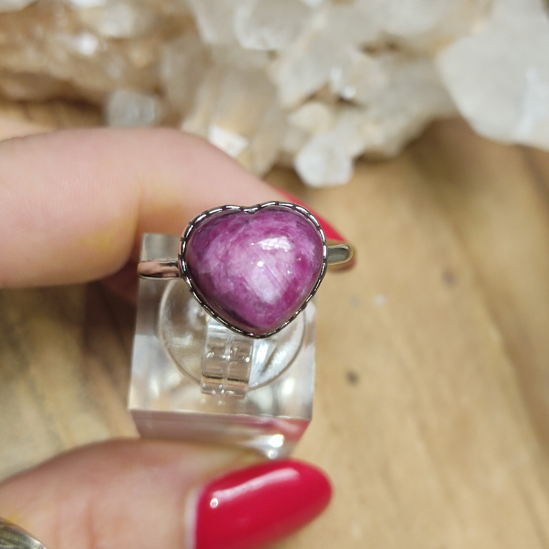 Deze gave ring met een robijn welke geslepen is in hartvorm is gezet in S925 zilver, verstelbaar en draagbaar van maat 17 tot maat 18.