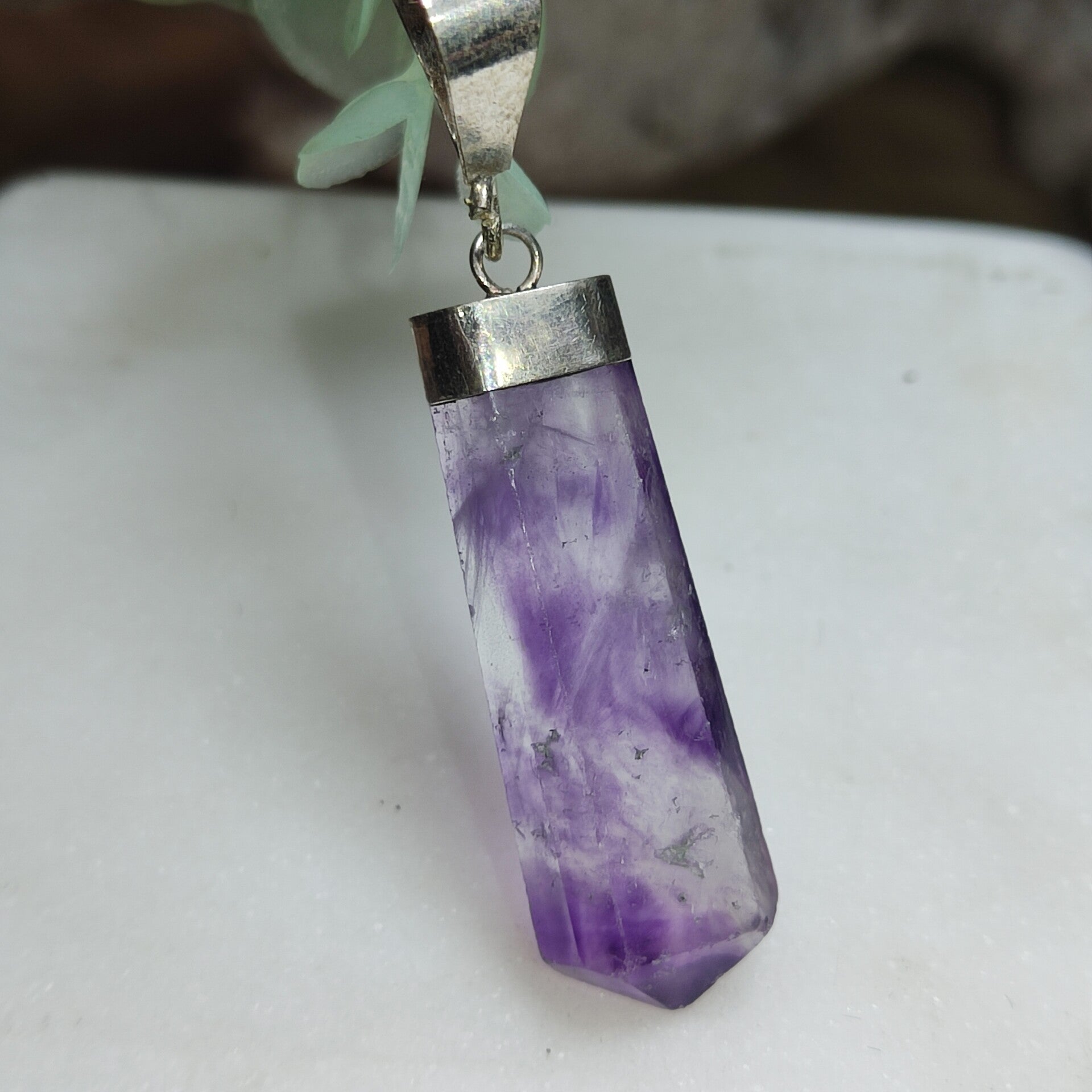 Deze mooie paarse fluoriet hanger is 4 cm lang en heeft een S925 zilveren oogje