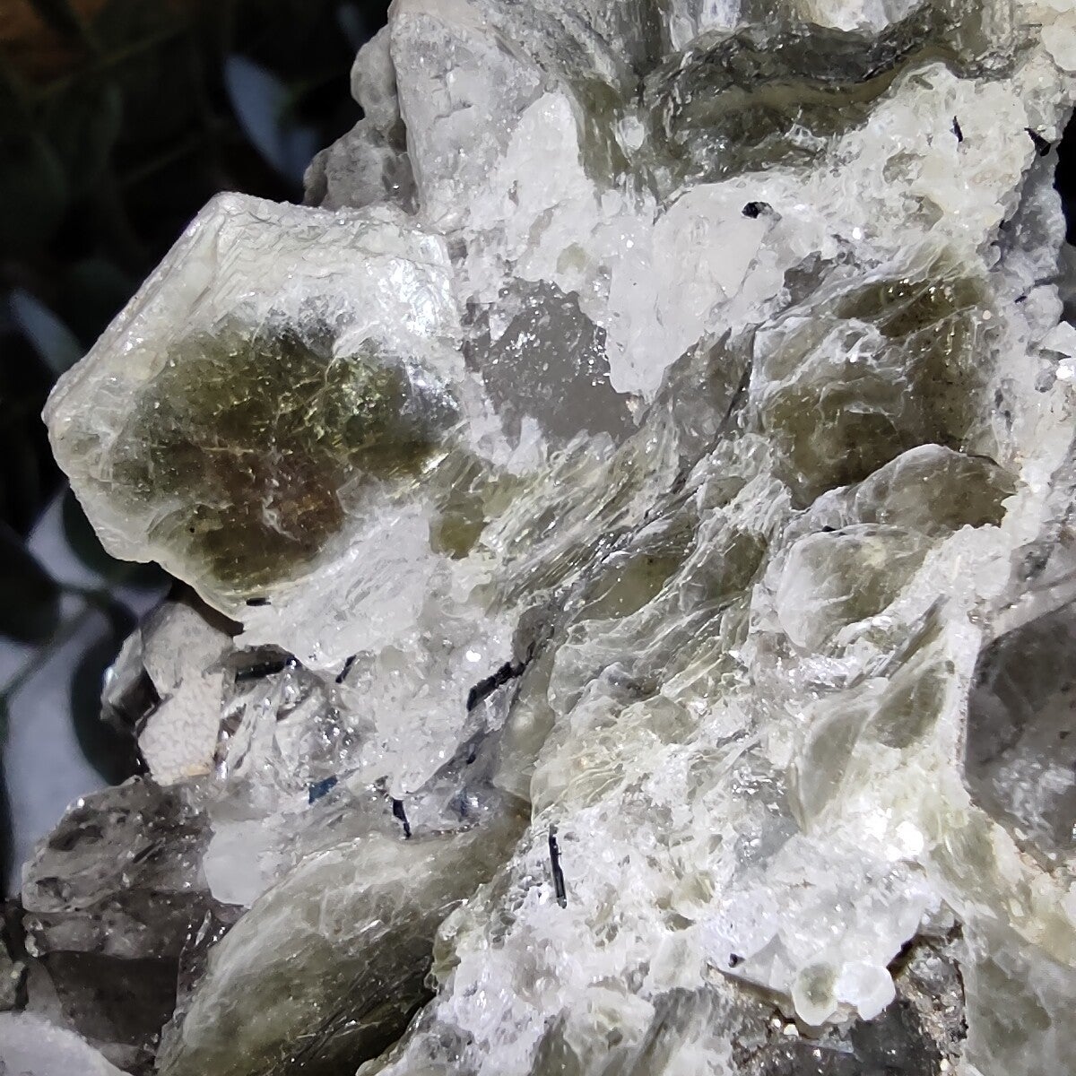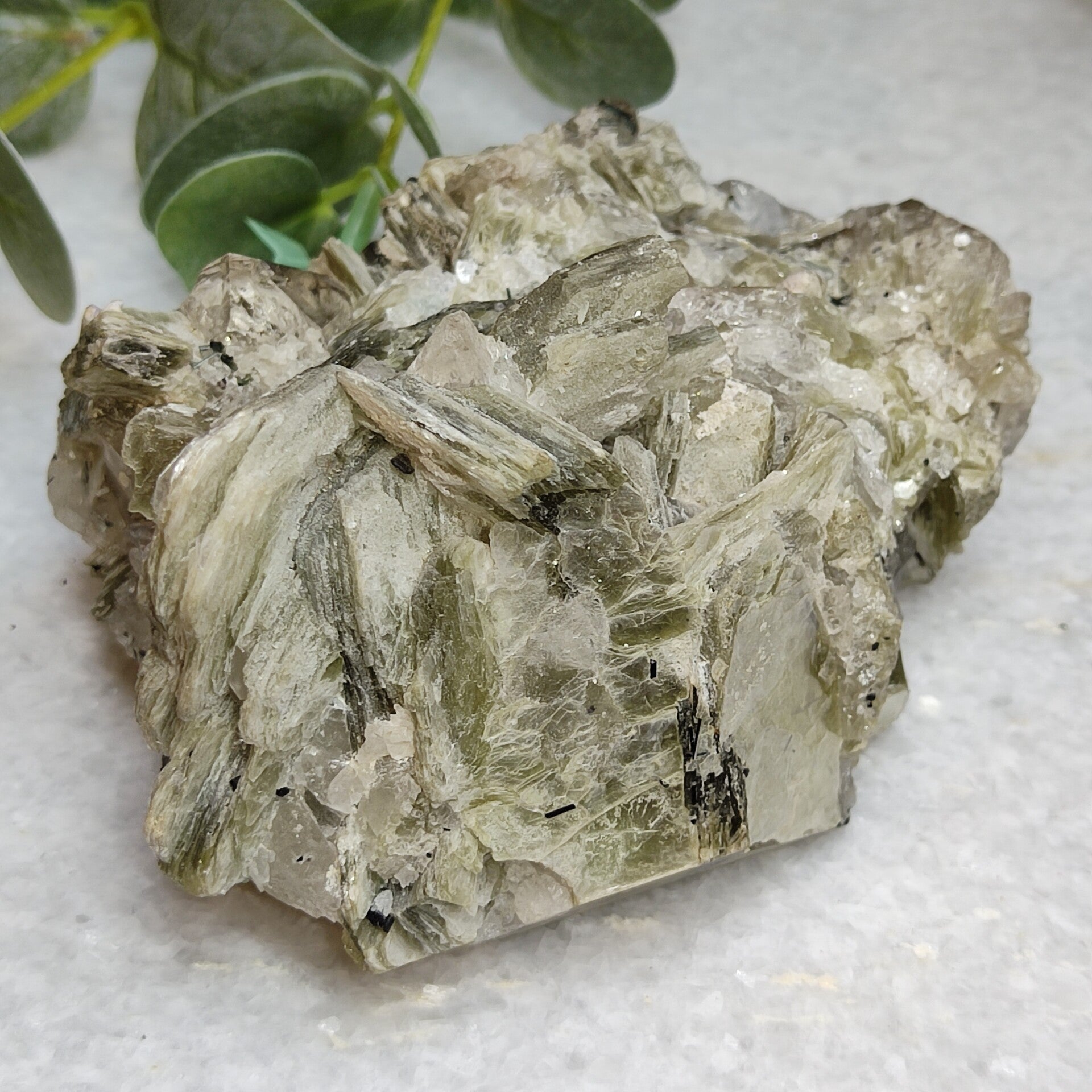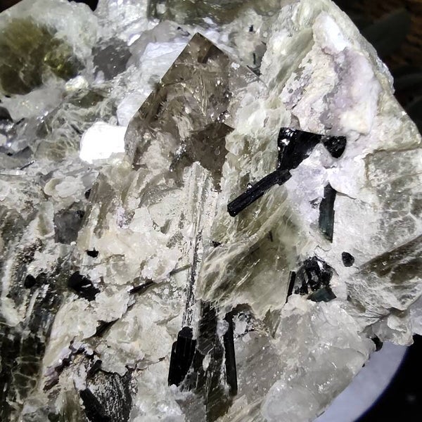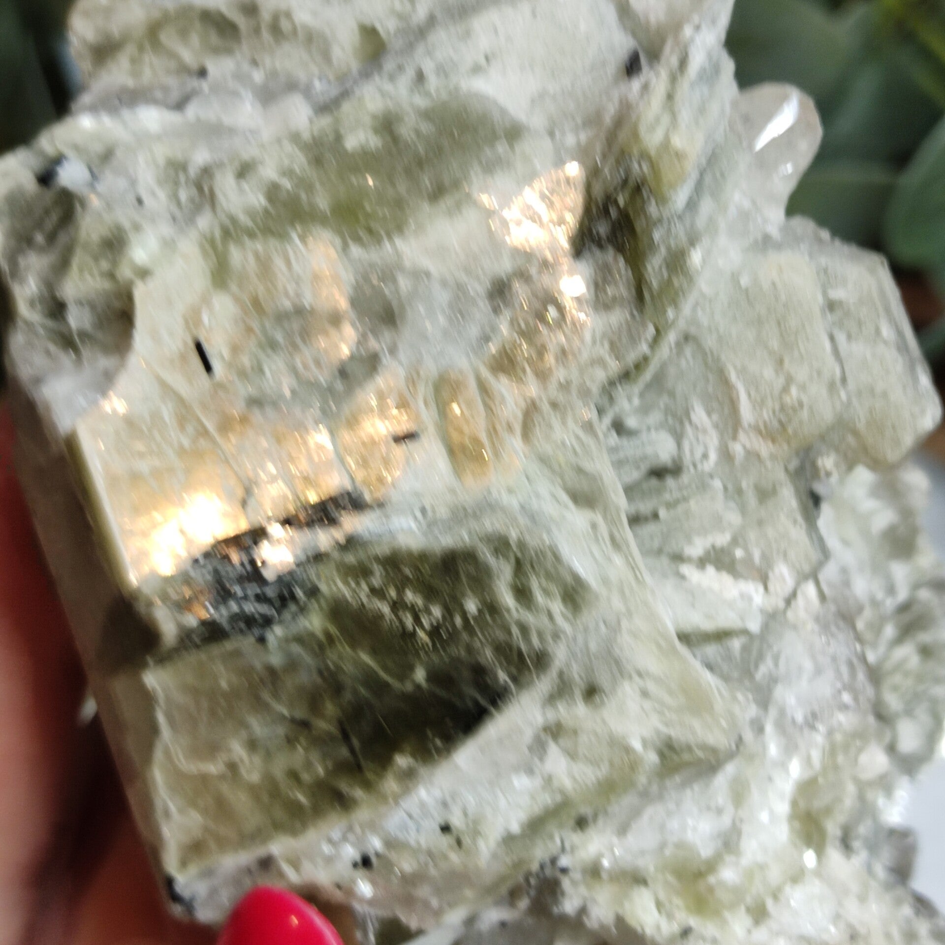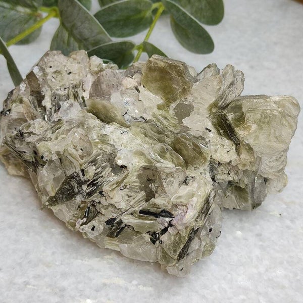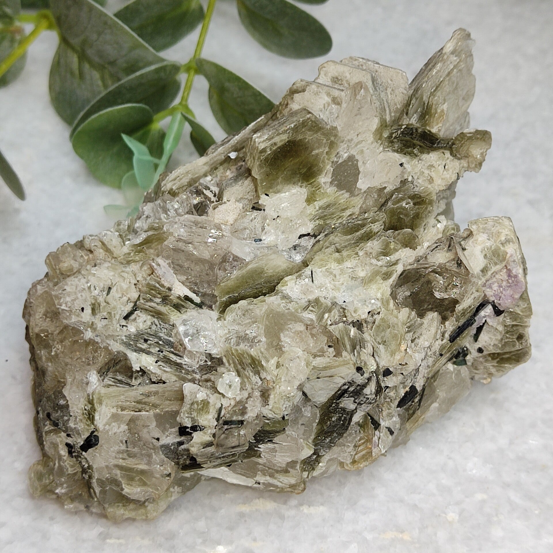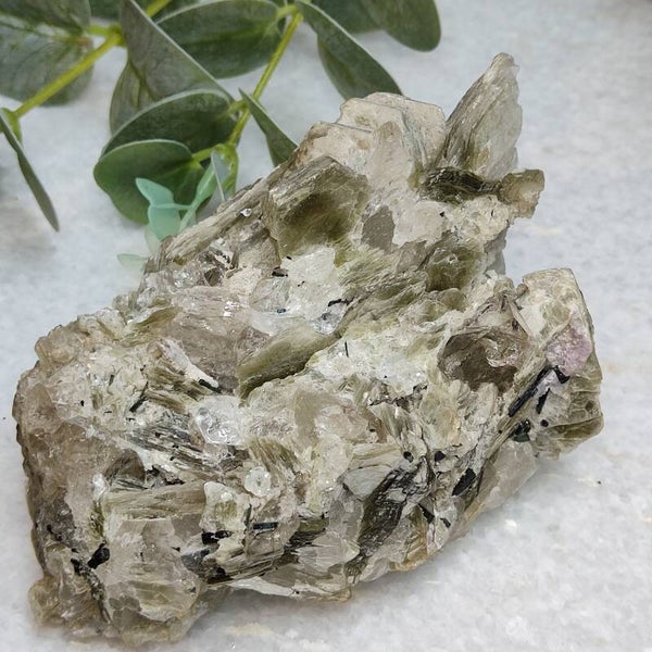 Deze groene muscoviet met combinatie van kwarts, Topaas en Groene Toermalijn is zo mooi!
