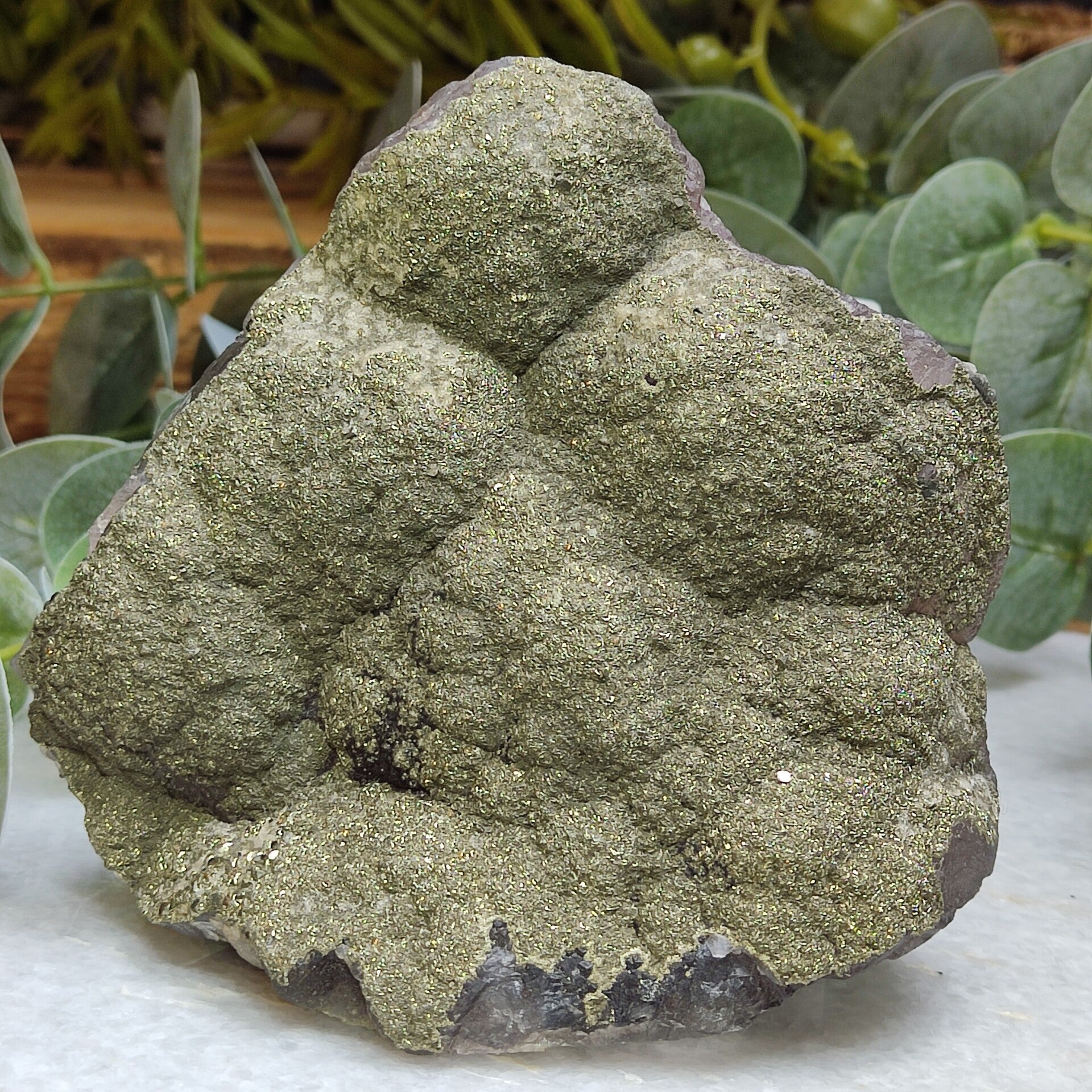 Dit supergave cluster van paarse fluoriet komt uit China en is begroeid met superglimmende pyriet kristallen. Aan de achterzijde van het cluster zie je het paarse fluoriet, wat onder uv ook blauw opschijnt, vol kleine witte kristallen in de "kraters".
