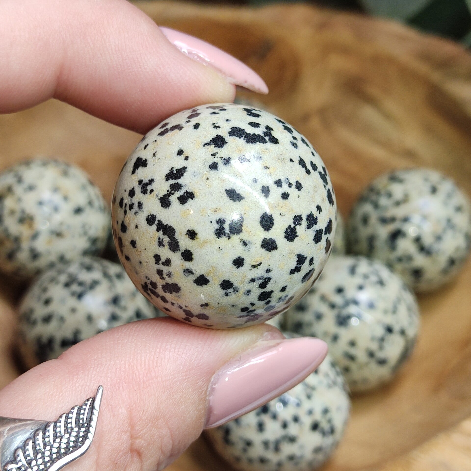 Evenwicht, Aarding & Harmonie, de kenmerken die passen bij deze "Dalmatiër Jaspis" trommelstenen. Deze mooierds komen uit Mexico en zijn ongeveer 2,5 centimter per stuk.