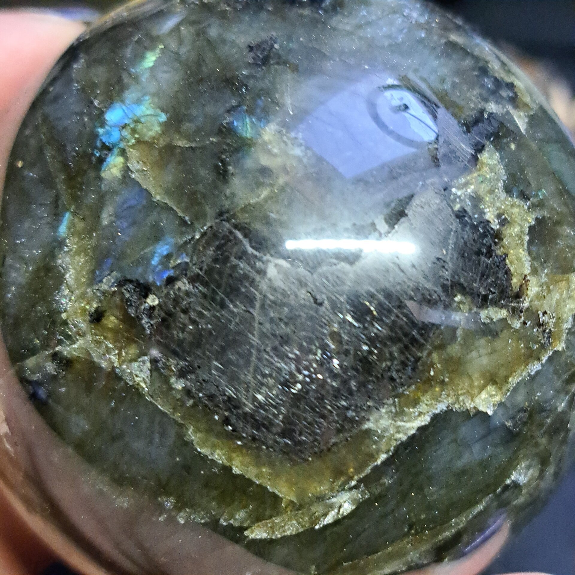 Deze gave bol van labradoriet heeft prachtige meerkleurige flash en is 669 gram en 7,5 cm groot.