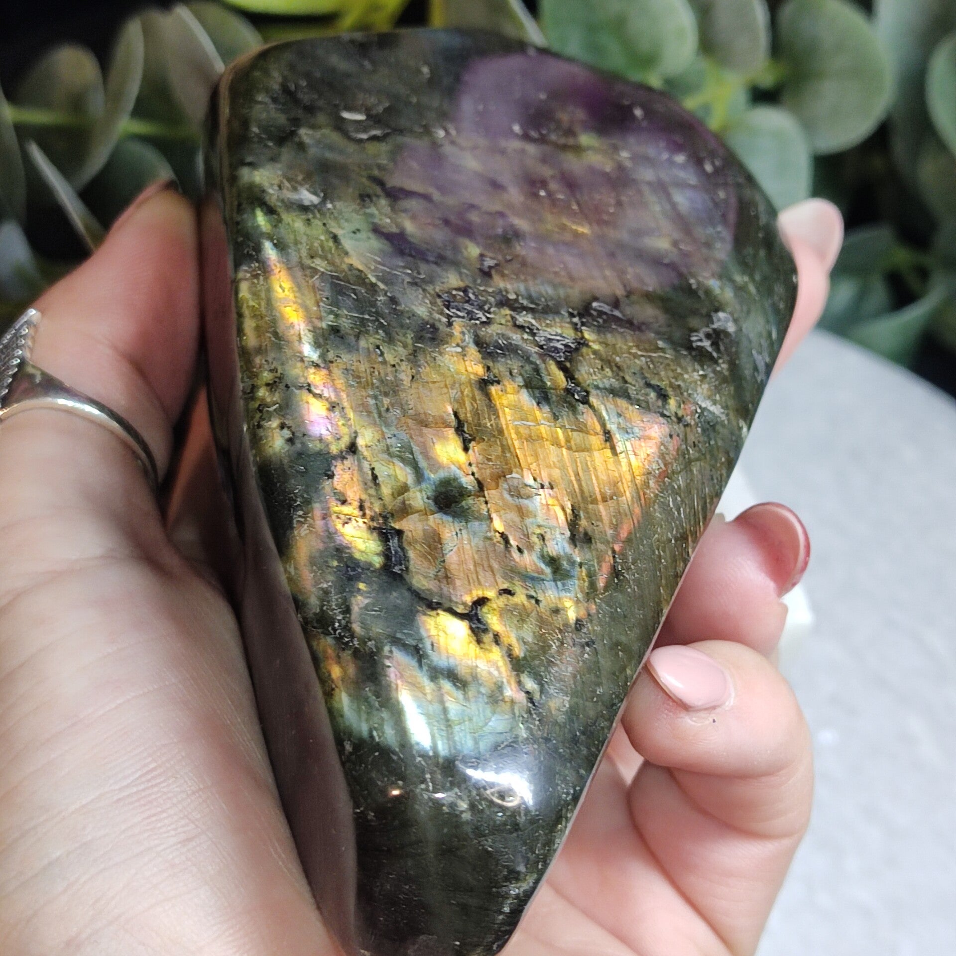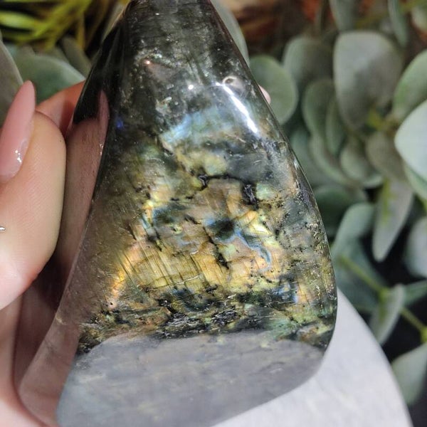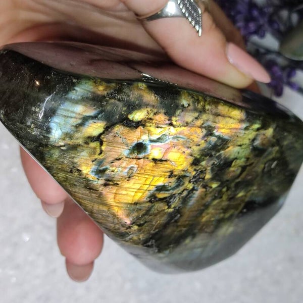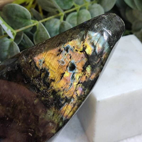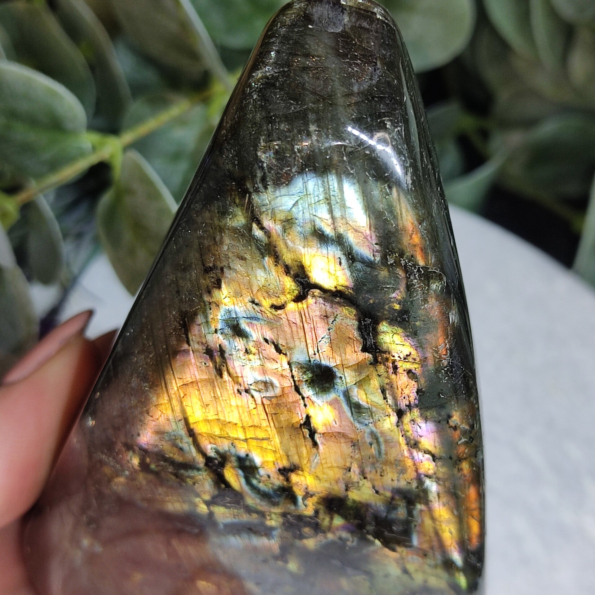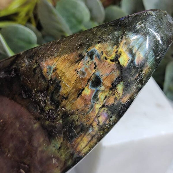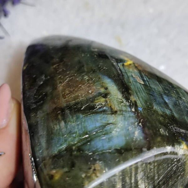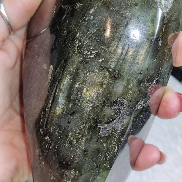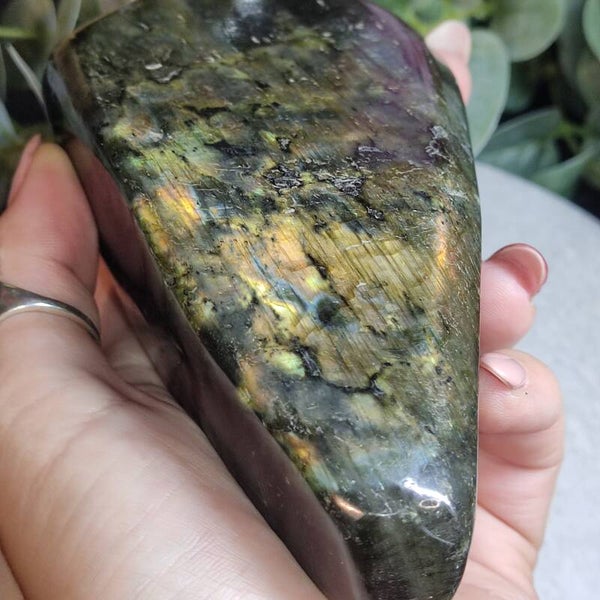 Deze mooie sculptuur van hele donkere labradoriet heeft prachtige meerkleurige flash, wel wat verstopt overigens ;-) en is 835 gram en 14,5 cm hoog.