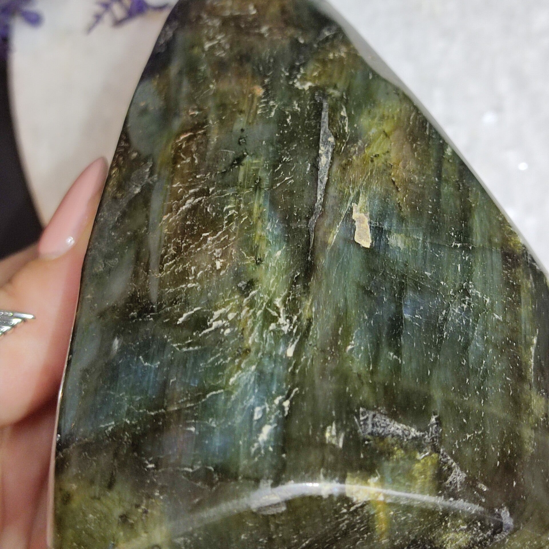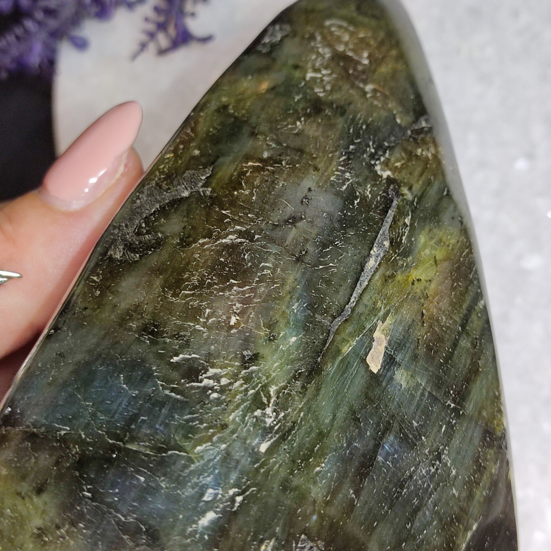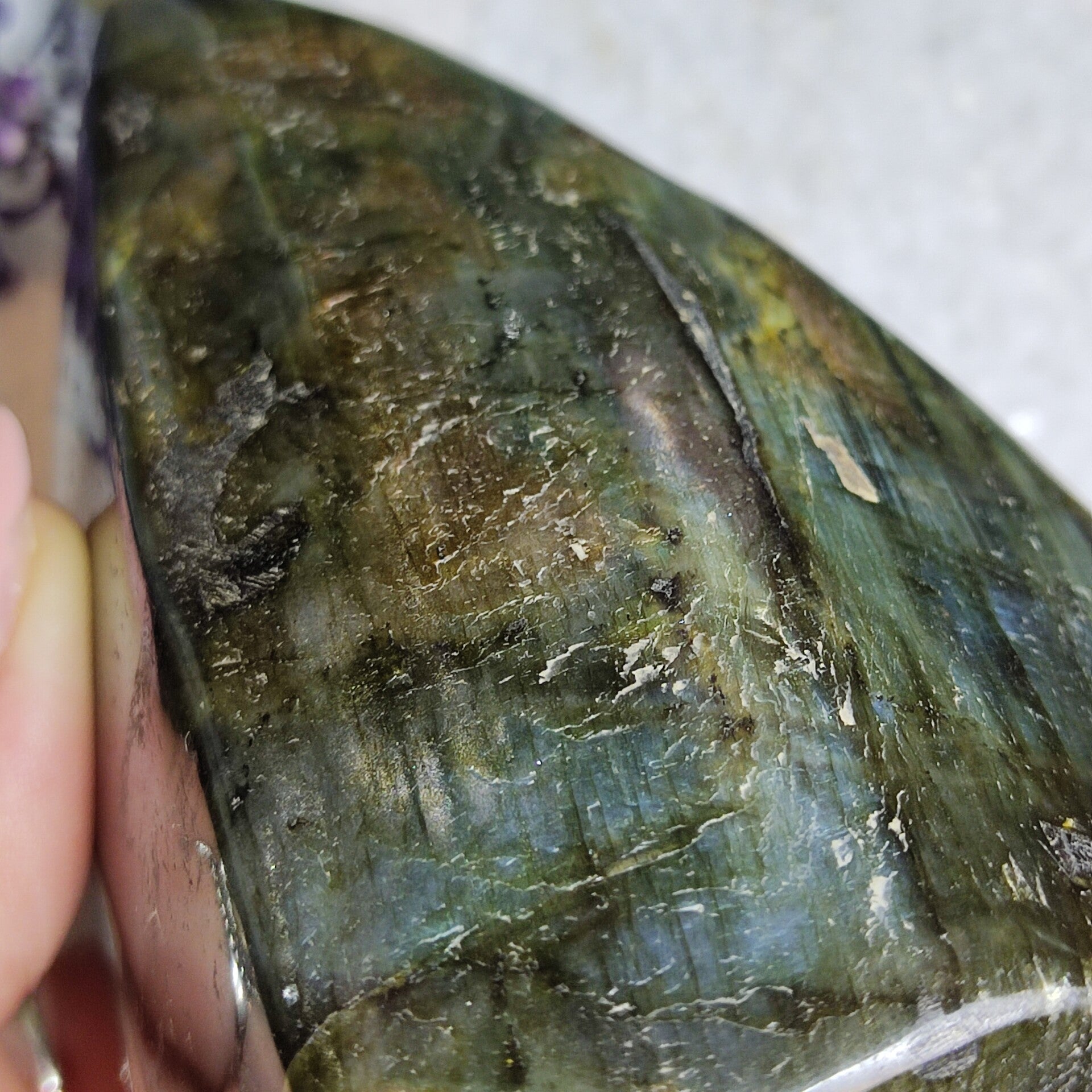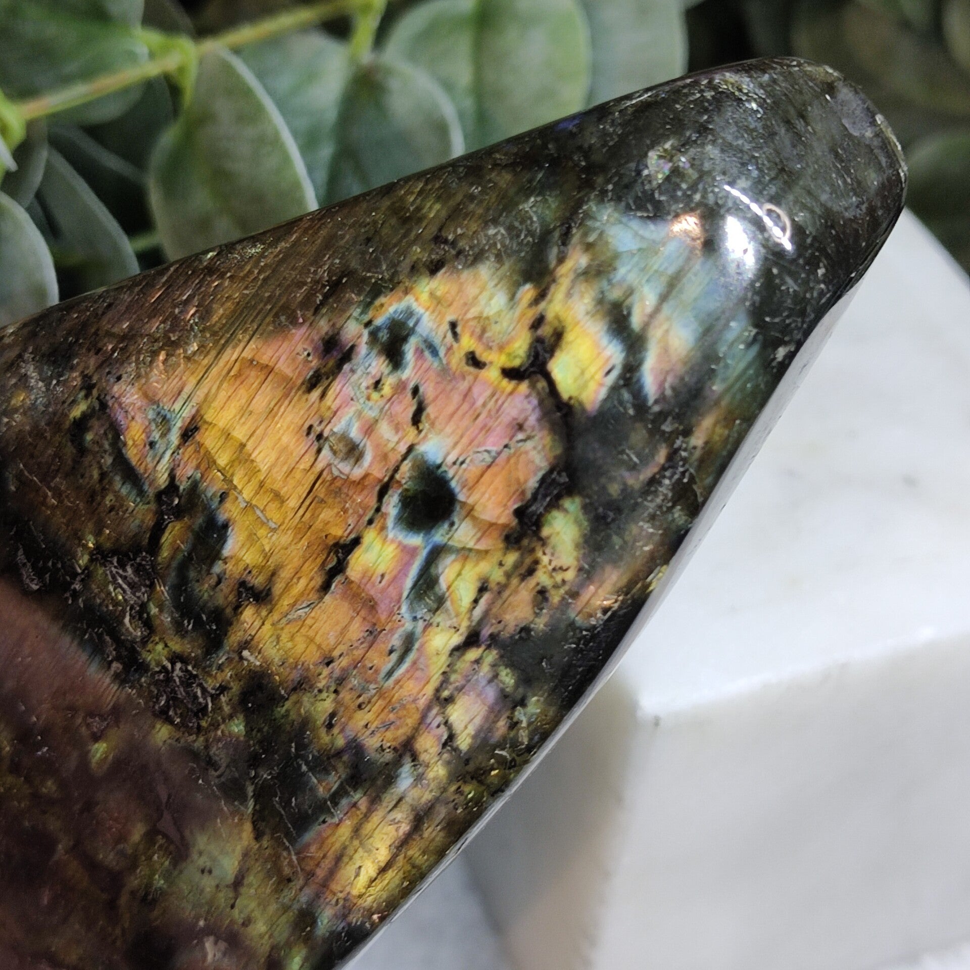 Deze mooie sculptuur van hele donkere labradoriet heeft prachtige meerkleurige flash, wel wat verstopt overigens ;-) en is 835 gram en 14,5 cm hoog.