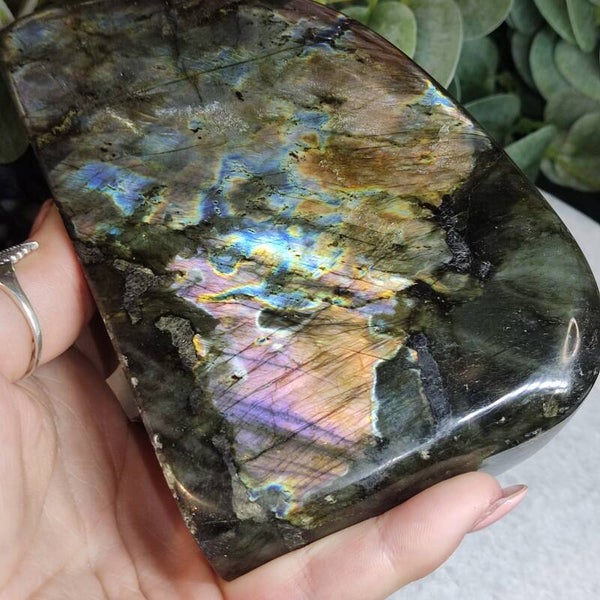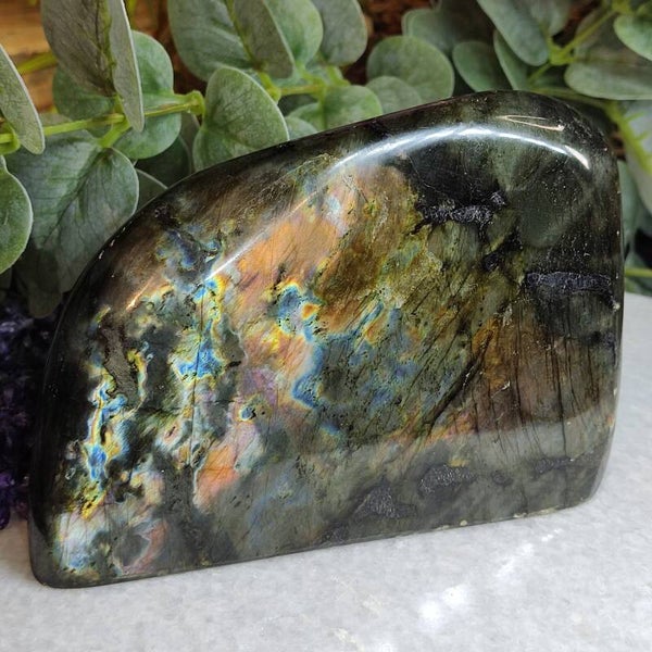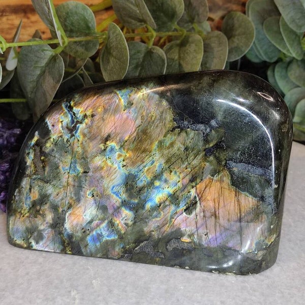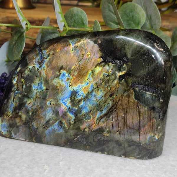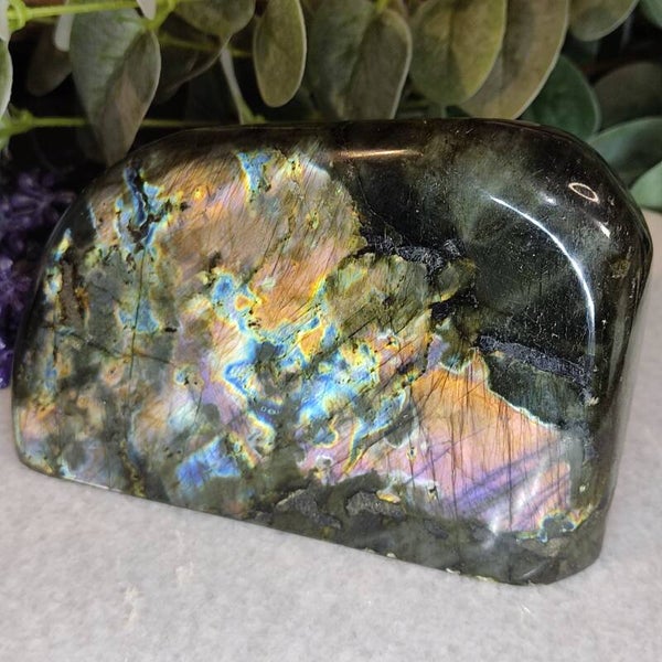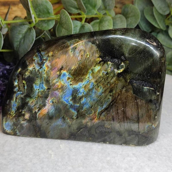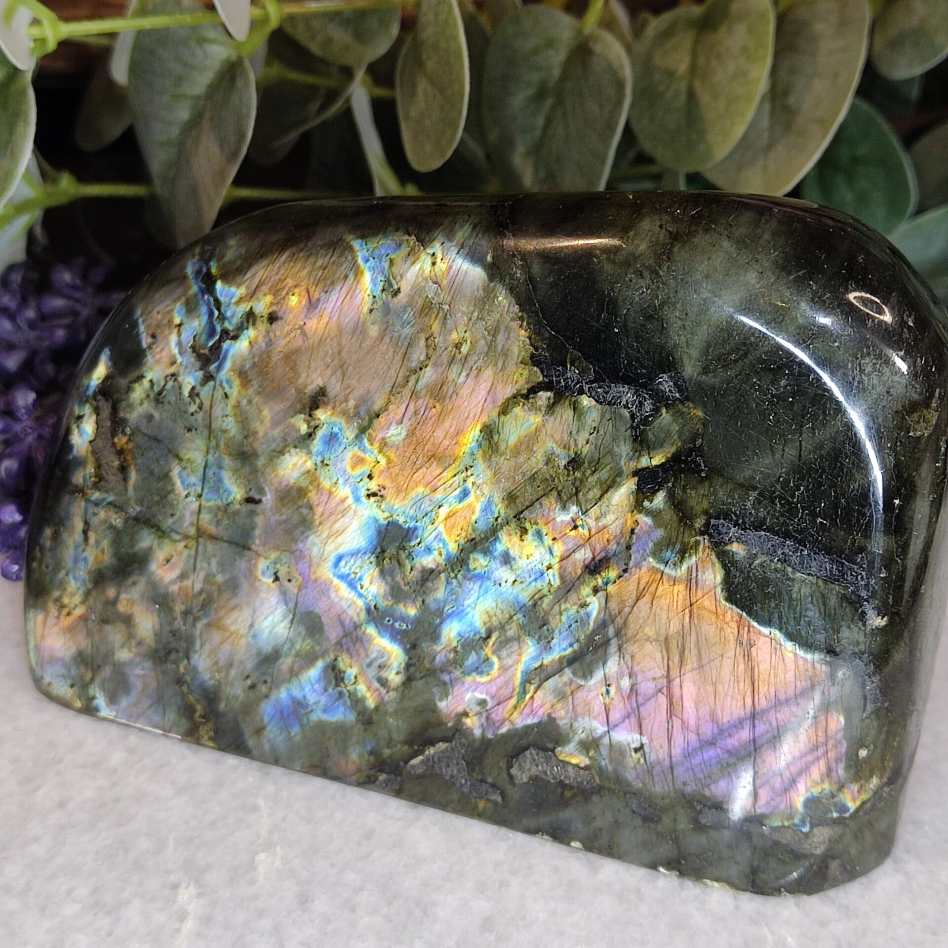 Dit prachtige sculptuur van labradoriet heeft bijzonder gave meerkleurige flash en is 930 gram en 13x9 cm groot.