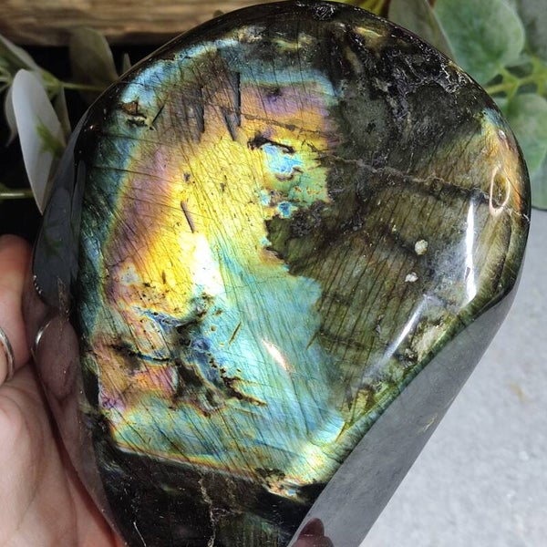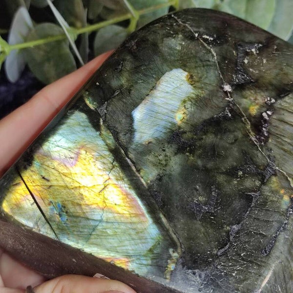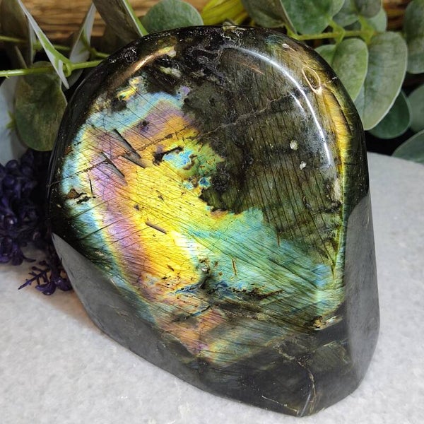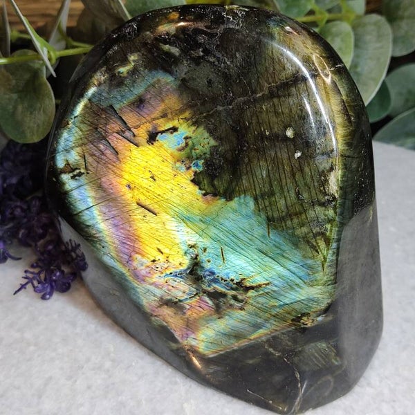 Dit prachtige sculptuur van labradoriet heeft bijzonder gave meerkleurige flash en is 1051 gram en 11x12 cm groot.