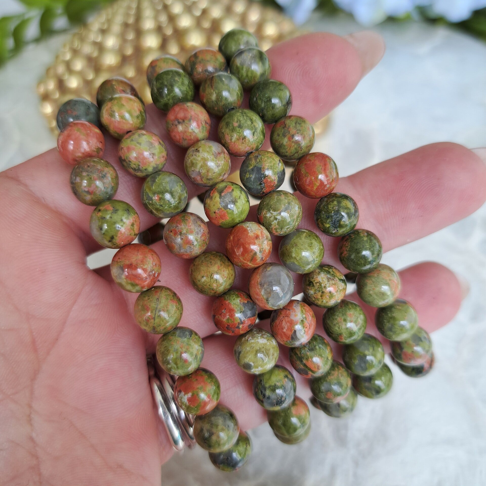 Draag de mooiste mineralen altijd bij je met deze mooie mineralen armband met Unakiet kraal van 8 mm, ze is elastisch en past om bijna iedere pols.