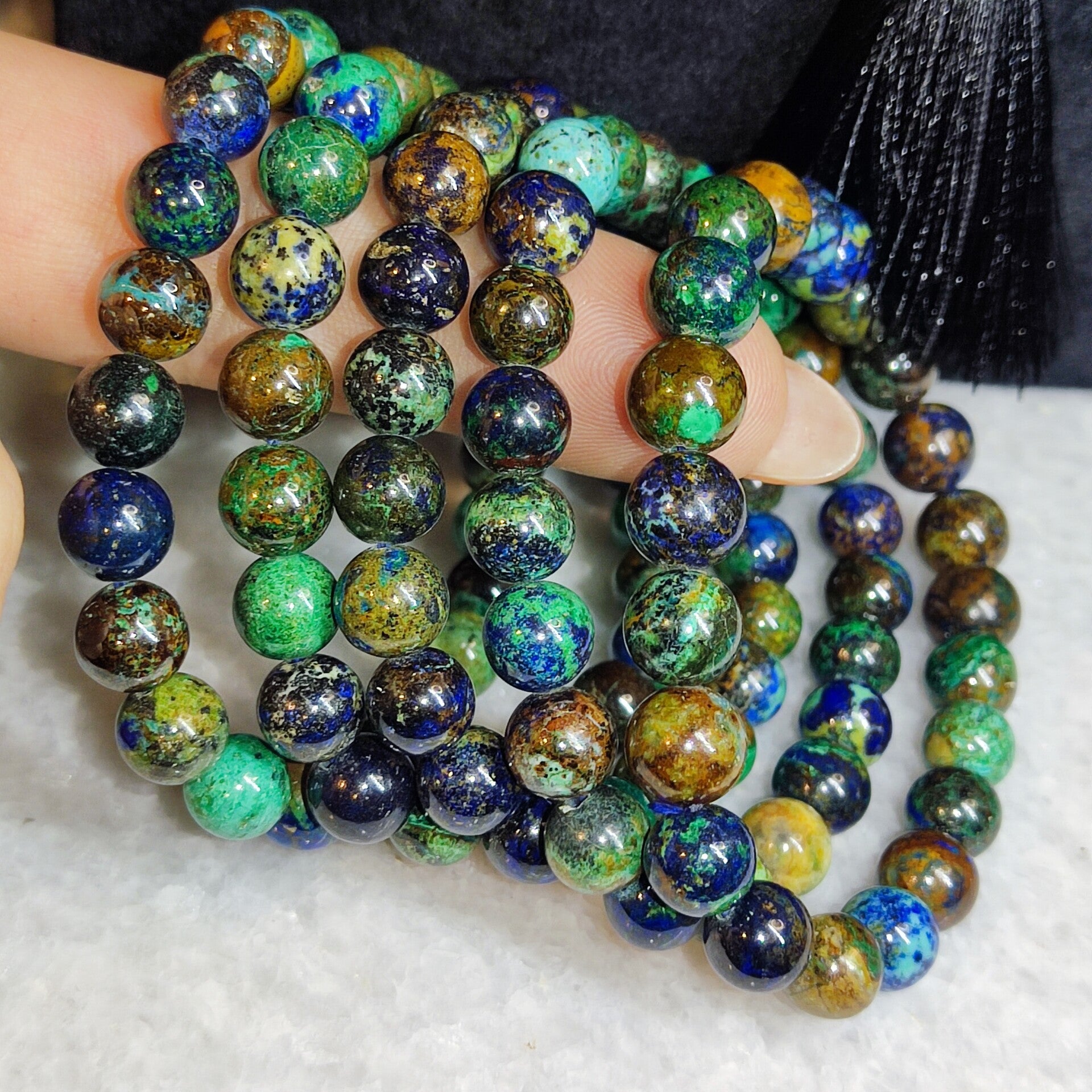 Draag de mooiste mineralen altijd bij je met deze mooie mineralen armband met Chrysocolla met Azuriet kraal van 8 mm, ze is elastisch en past om bijna iedere pols.