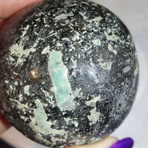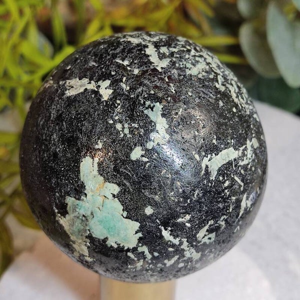 Deze bol van Smaragd met Basalt is 414 gram en 6,2 cm groot.
