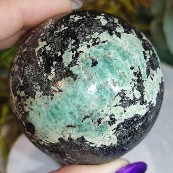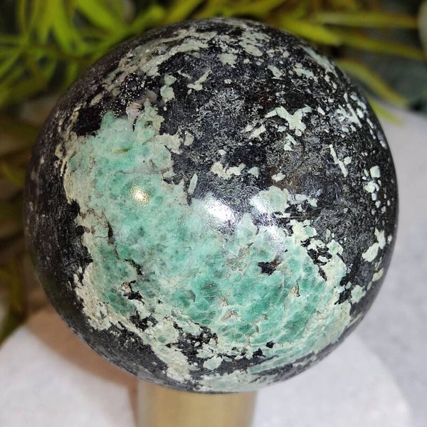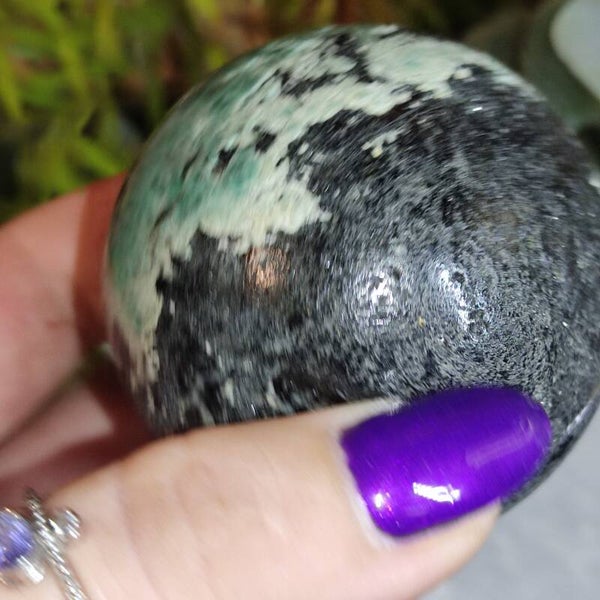Deze bol van Smaragd met Basalt is 351 gram en 6 cm groot.