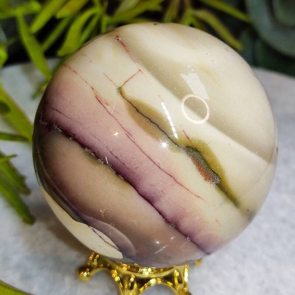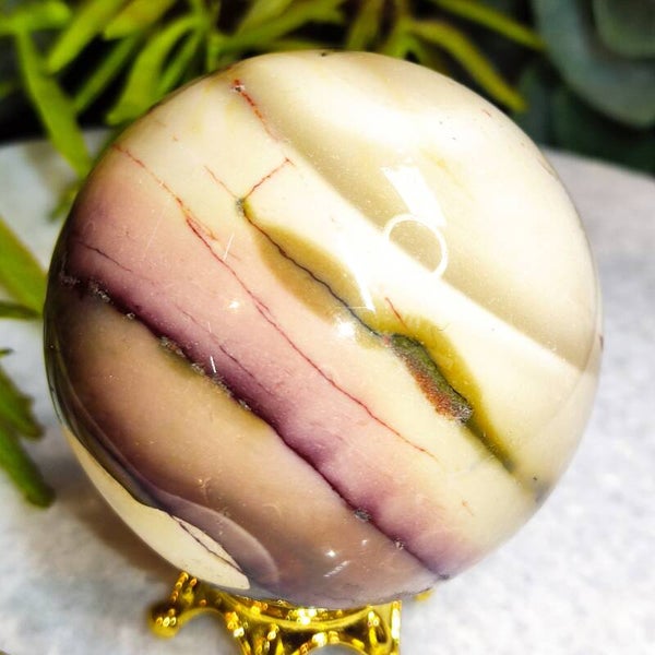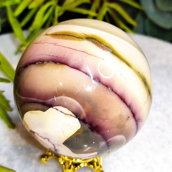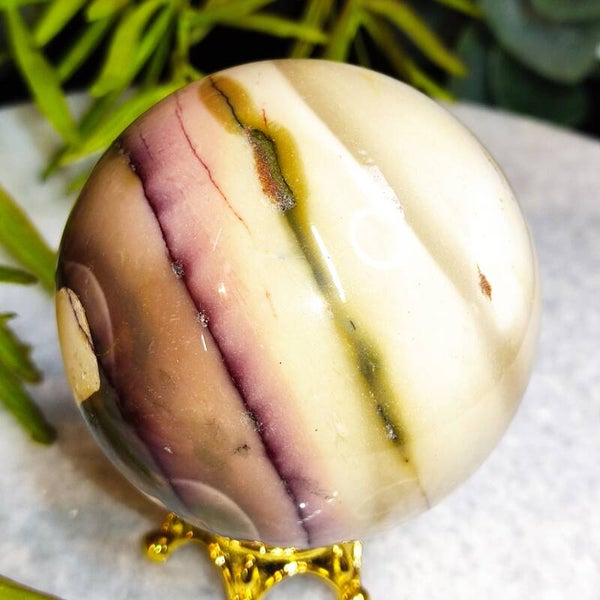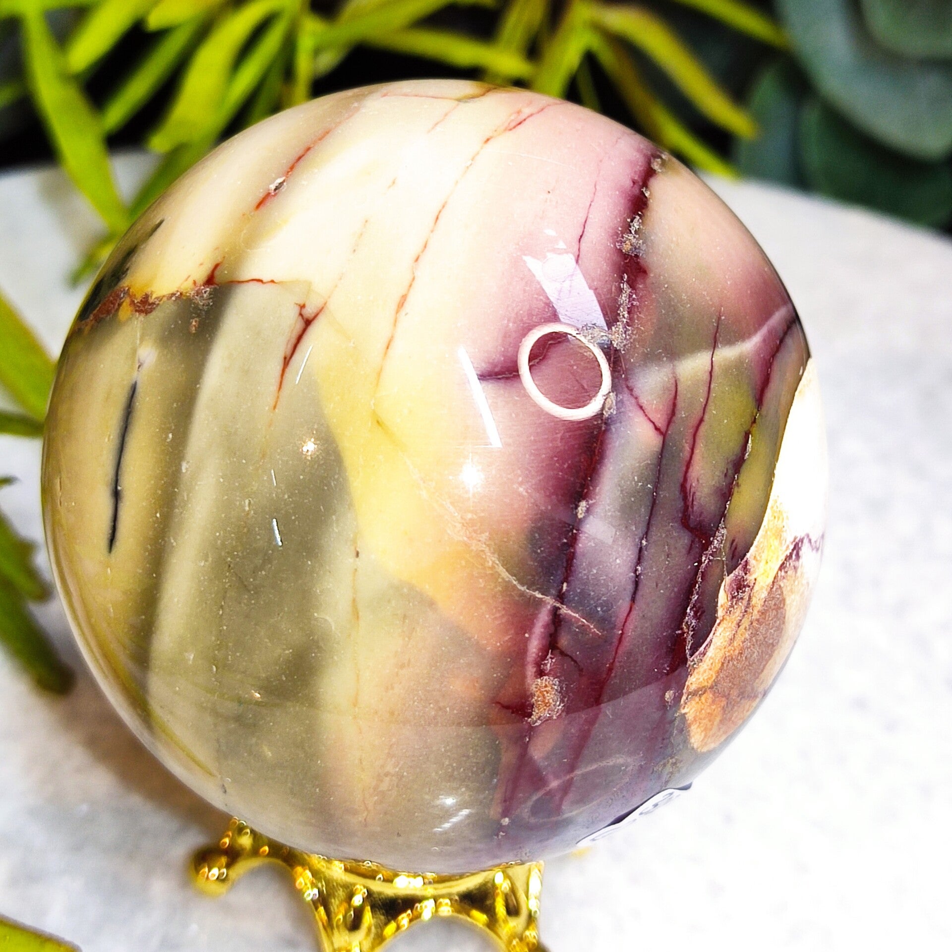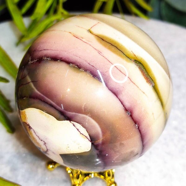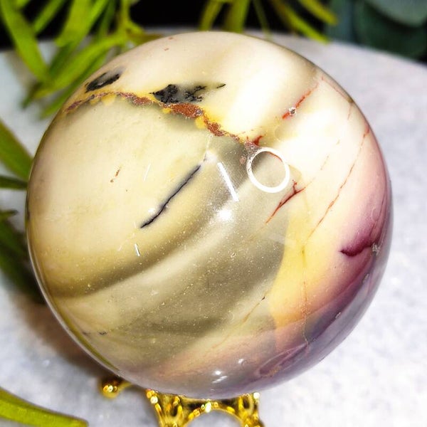 Mookaiet is een sterk aardendende en verwarmende steen met aparte marmering van de kleuren geel, wit, rood en soms zelfs paars.
