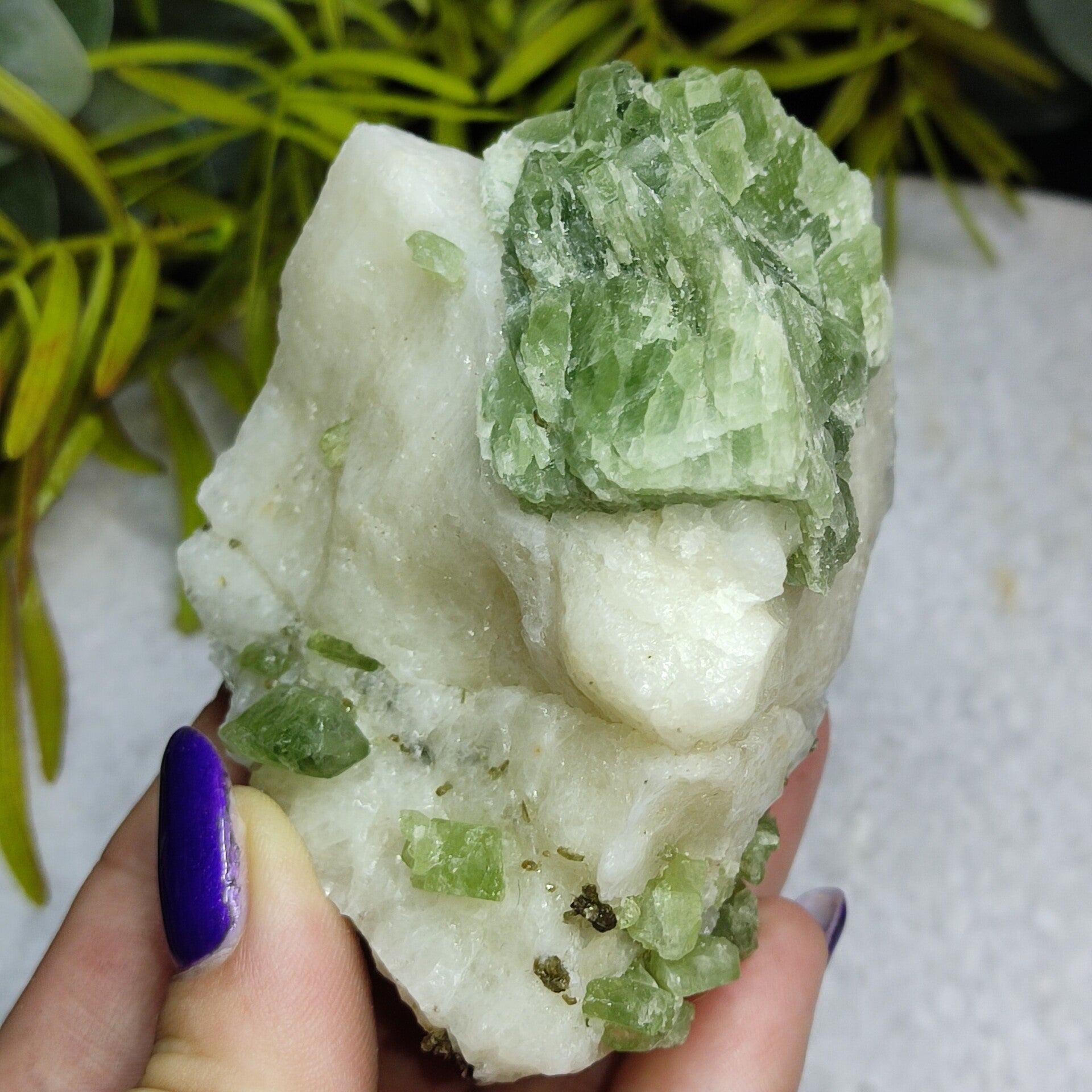 Dit prachtige ruwe cluster vol grote groene kristallen op witte Calciet Matrix komt uit Pakistan en is 292 gram en 7,9x5,8cm groot.