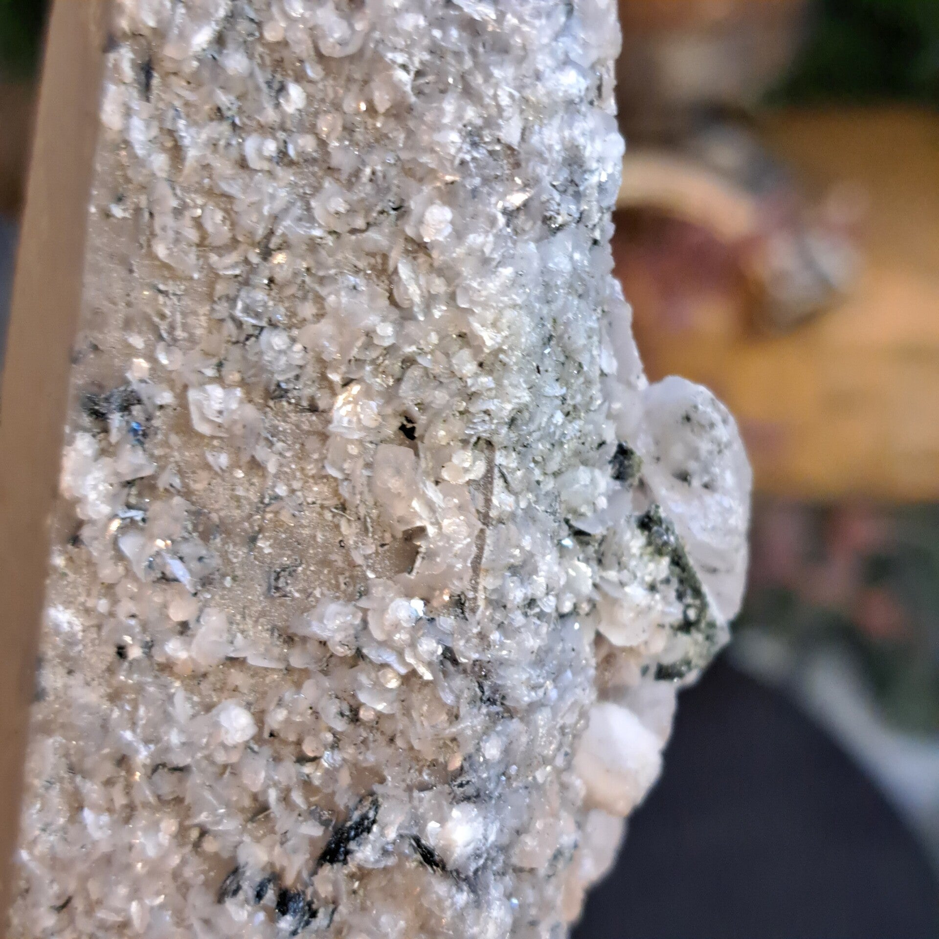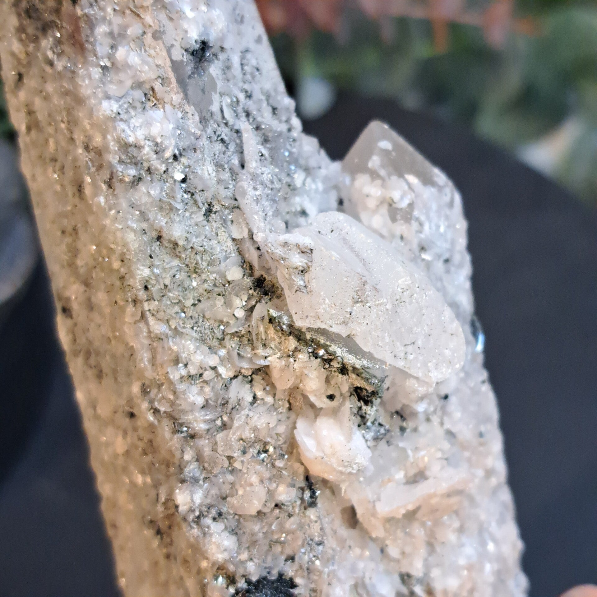 De ruwe stukken met prachtige formatie komen uit Binnen Mongolie en dit super glimmende stuk met calciet is 308 gram en 14 cm groot.