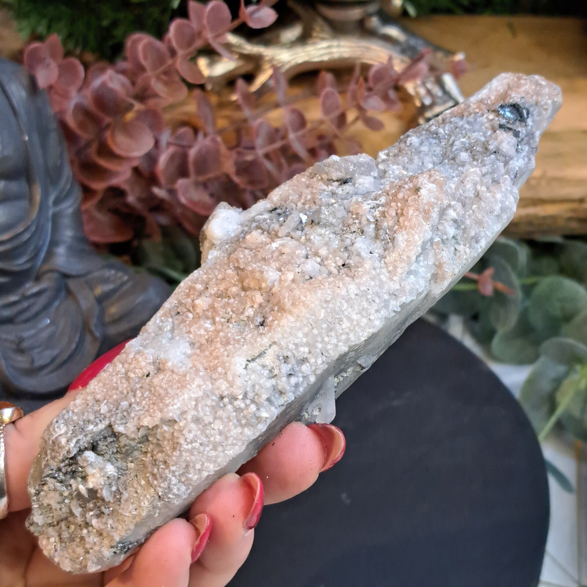 De ruwe stukken met prachtige formatie komen uit Binnen Mongolie en dit super glimmende stuk met calciet is 411 gram en 18,5 cm groot.