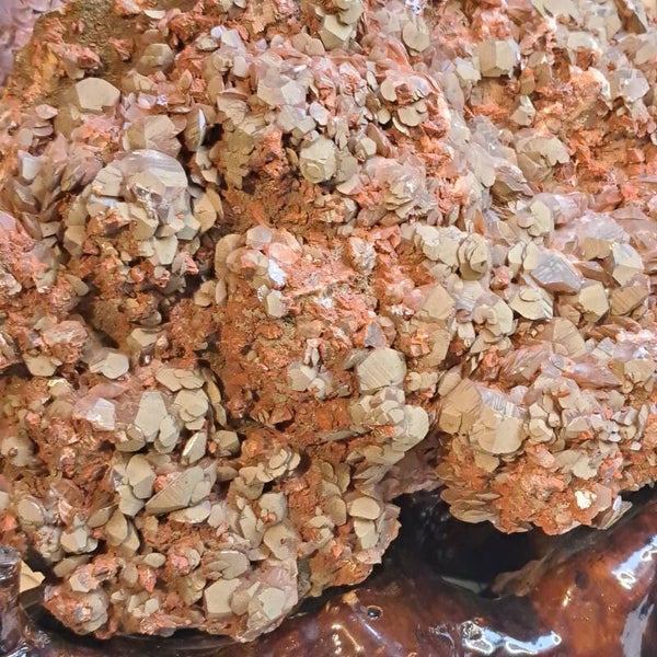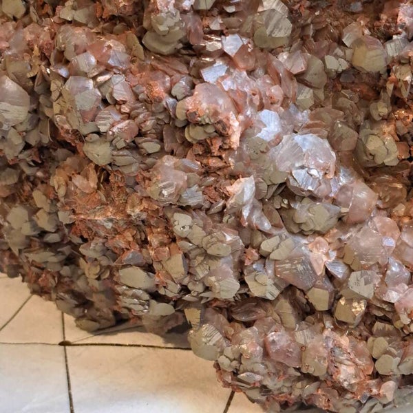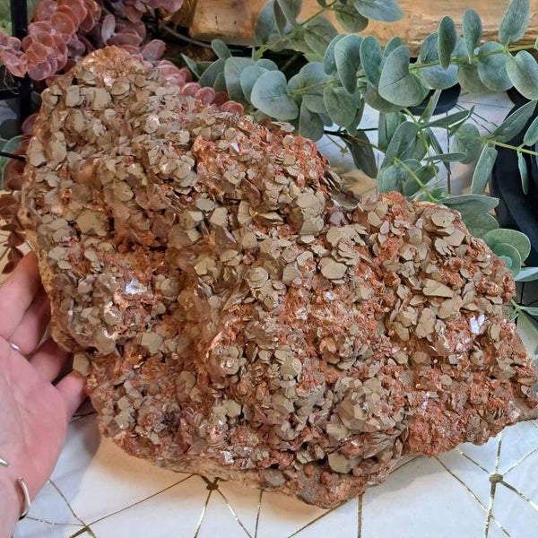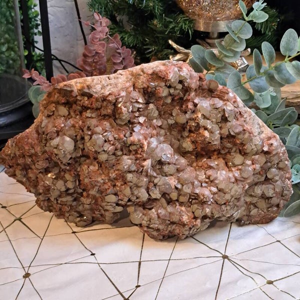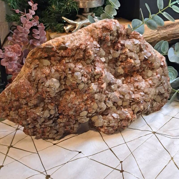 Wat een prachtig XXL cluster is deze fantastische calciet met insluitingen van hematiet waardoor het de gave rode kleur heeft gekregen maar het mooiste is misschien nog wel de insluitingen van pyriet wat de hele werking nog extra versterkt!