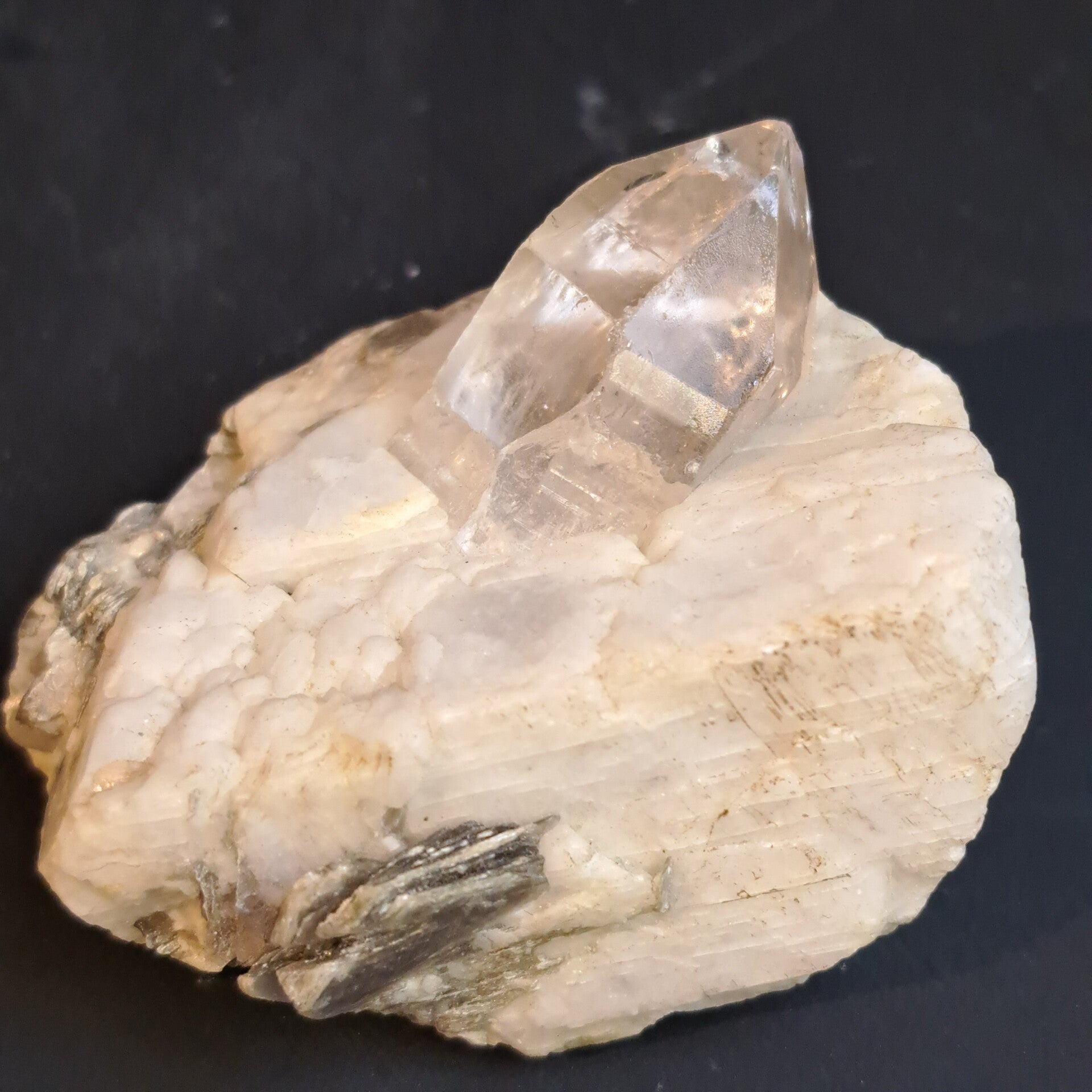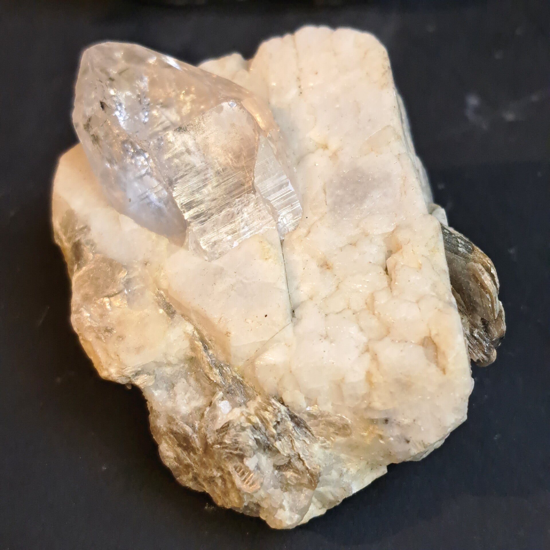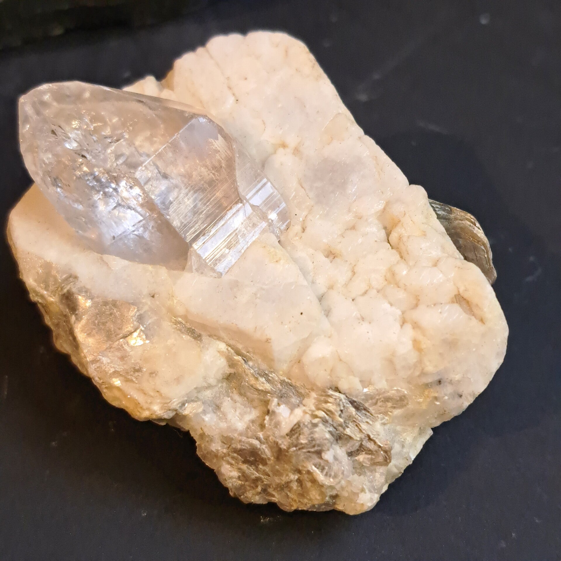 Dit prachtige grote topaas kristal ligt in haar glimmende moedergesteente Albiet (Veldspaat) waar ook wat prachtig groene muscoviet in en op zit.