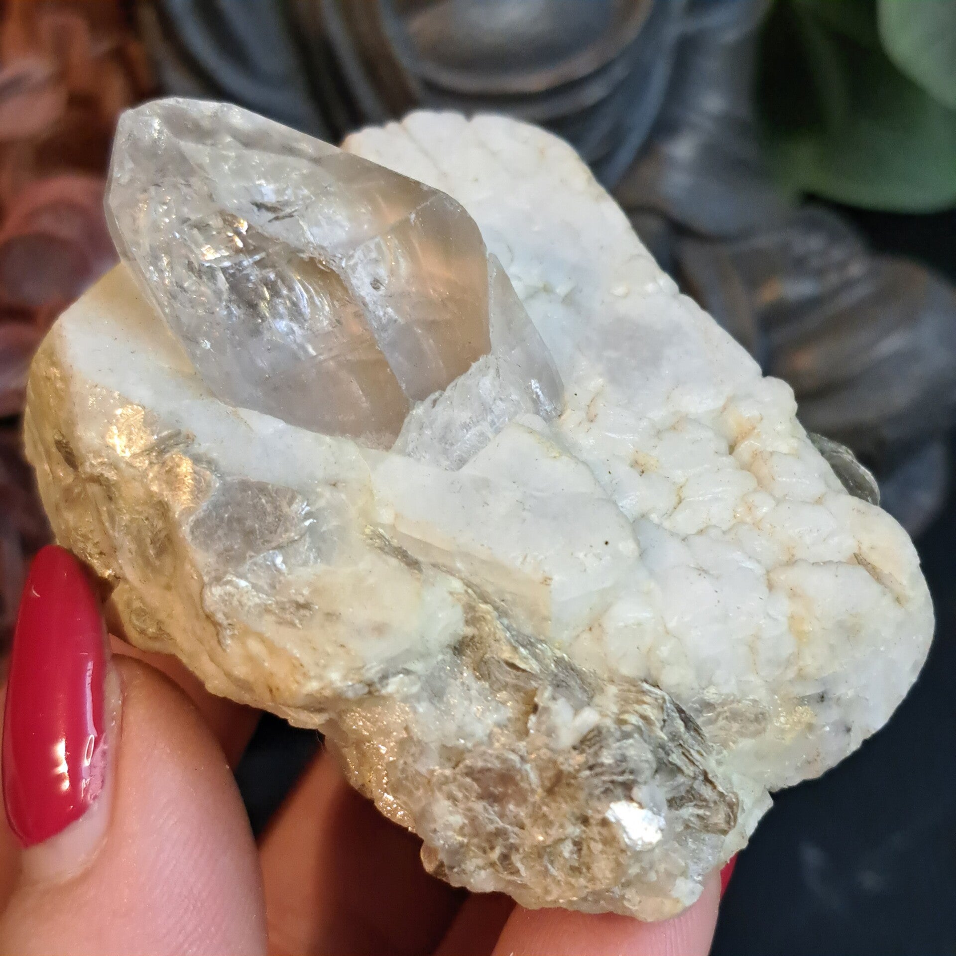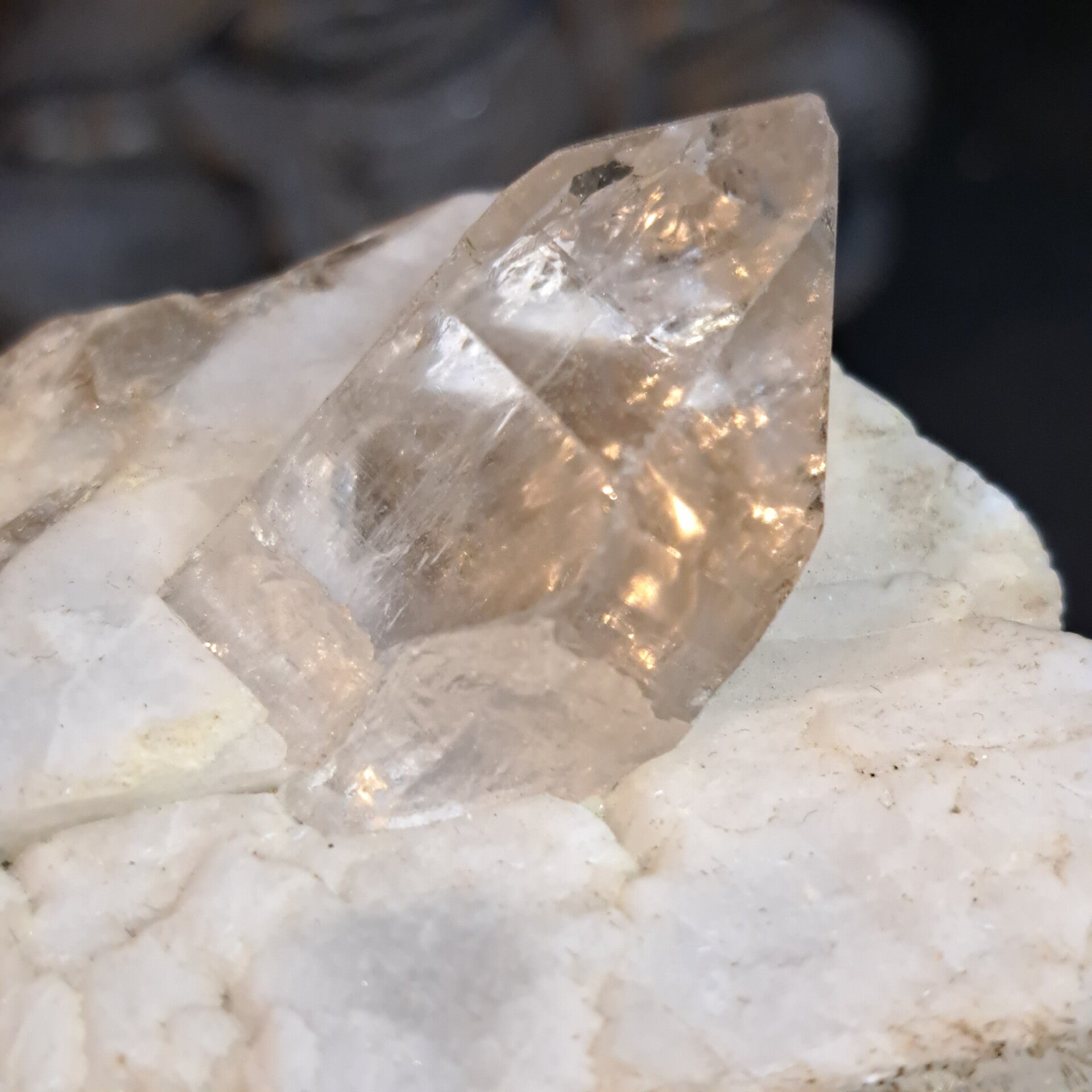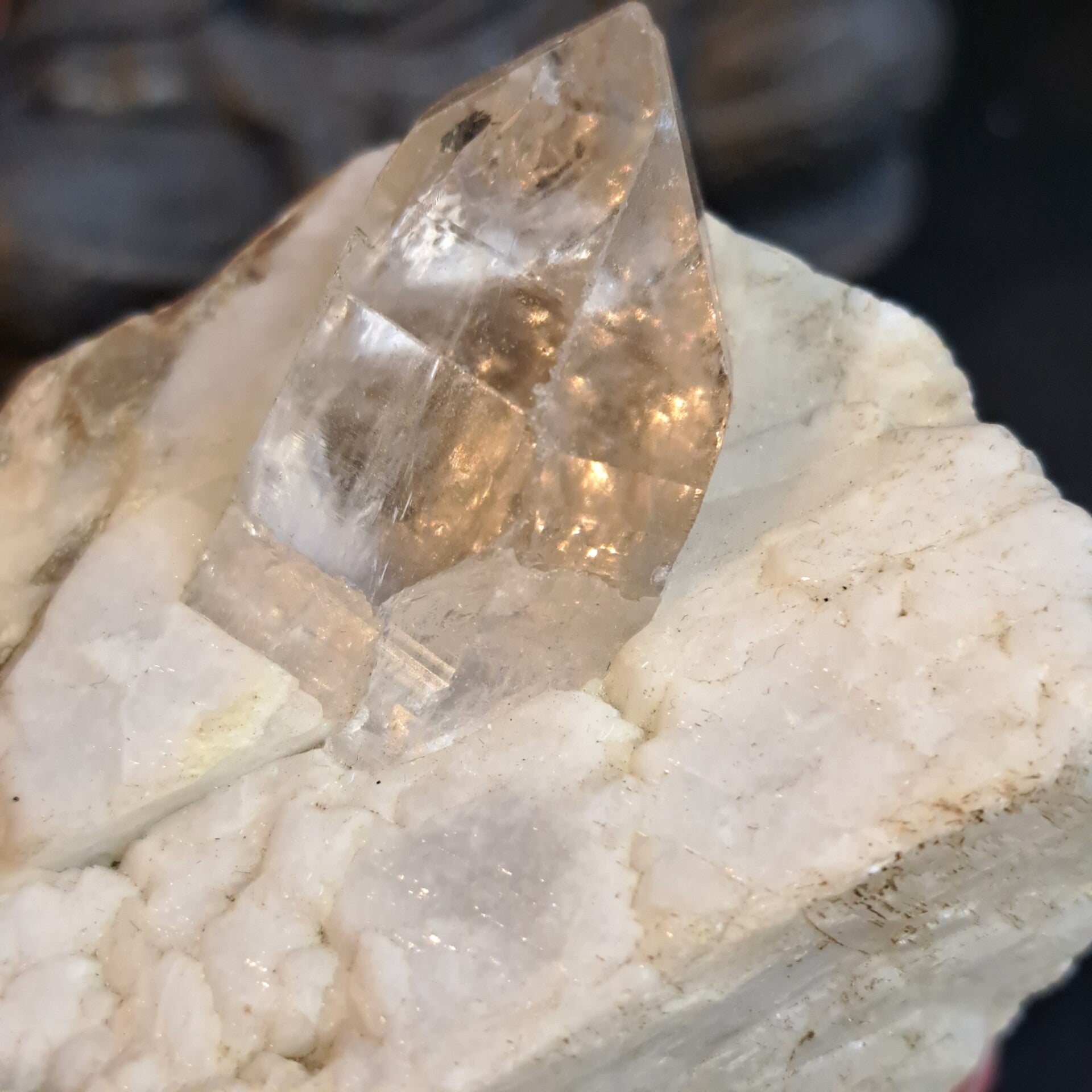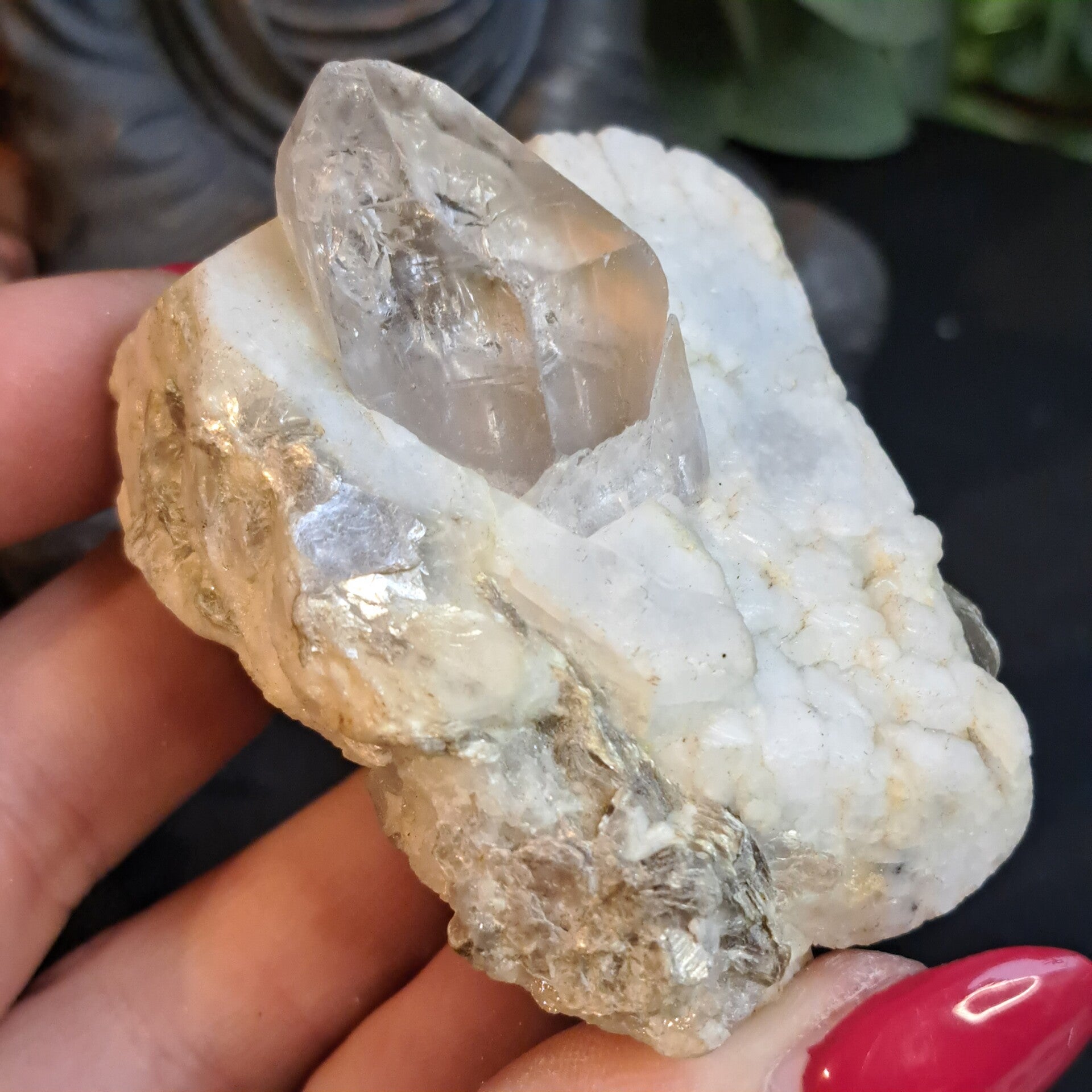 Dit prachtige grote topaas kristal ligt in haar glimmende moedergesteente Albiet (Veldspaat) waar ook wat prachtig groene muscoviet in en op zit.