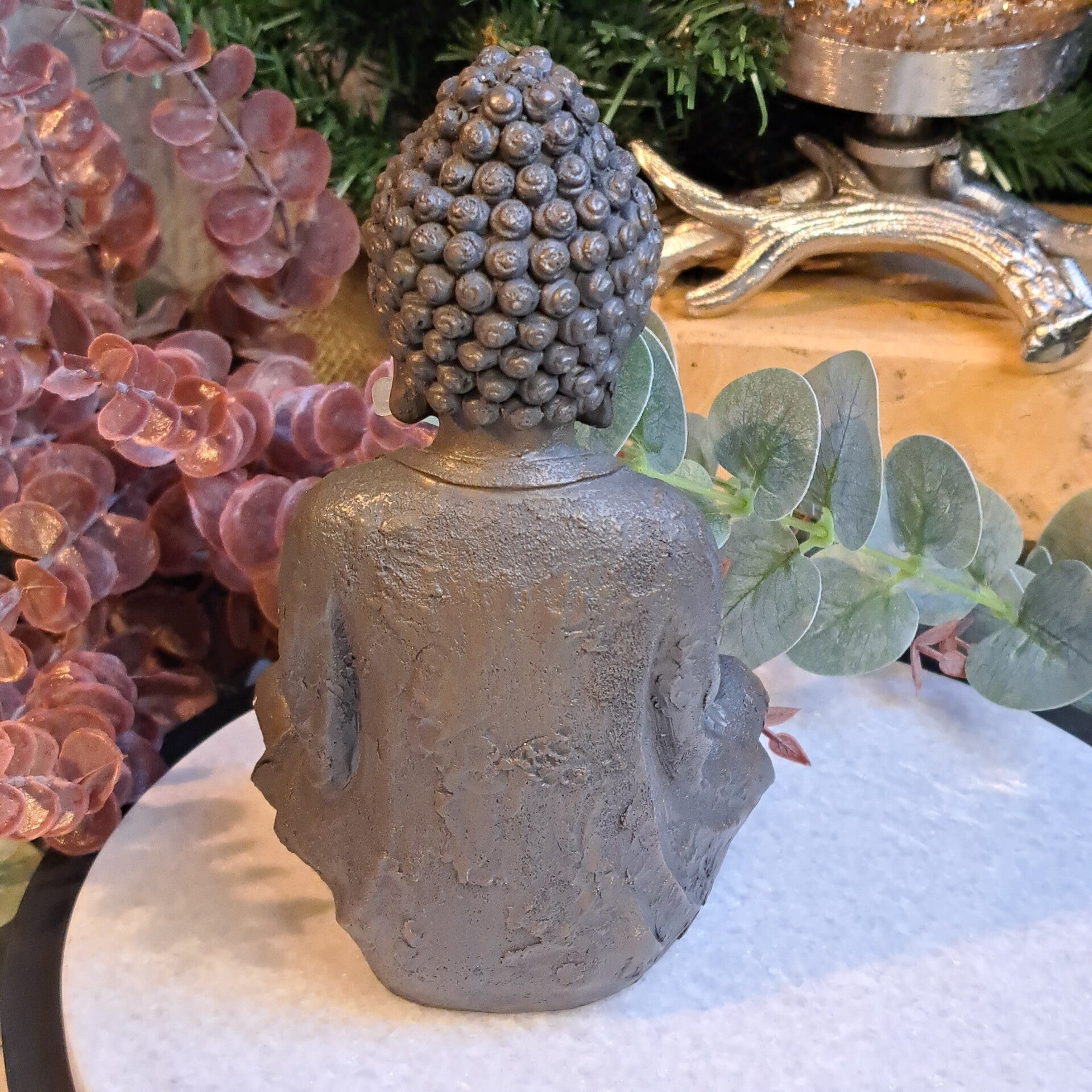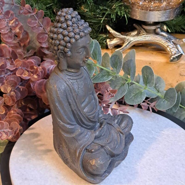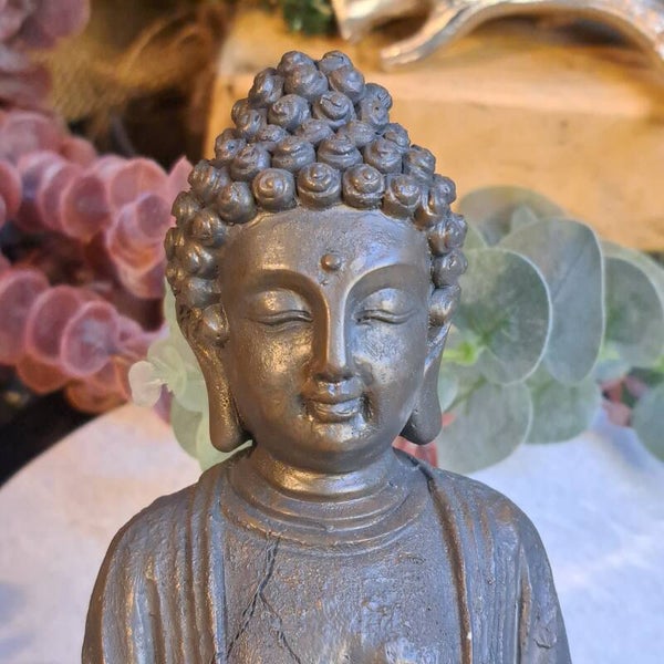 Prachtig beeld van een vriendelijk mediterende buddha. Ziet eruit als een bronzen beeld maar gemaakt van polyresin en is 19 cm groot.