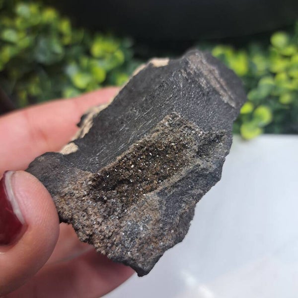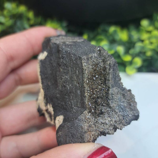 Dit prachtige stuk gepermineraliseerd, ofwel gekristalliseerd versteend en verkoold hout, vol natuurlijke glimmers komt uit Indonesië en is 178 gram en 8,5 cm groot.