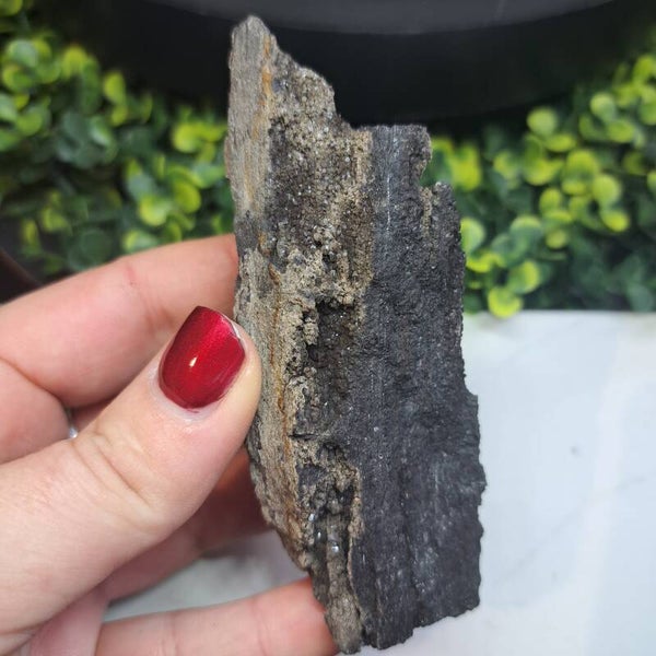 Dit prachtige stuk gepermineraliseerd, ofwel gekristalliseerd versteend en verkoold hout, vol natuurlijke glimmers komt uit Indonesië en is 118 gram en 11 cm groot.