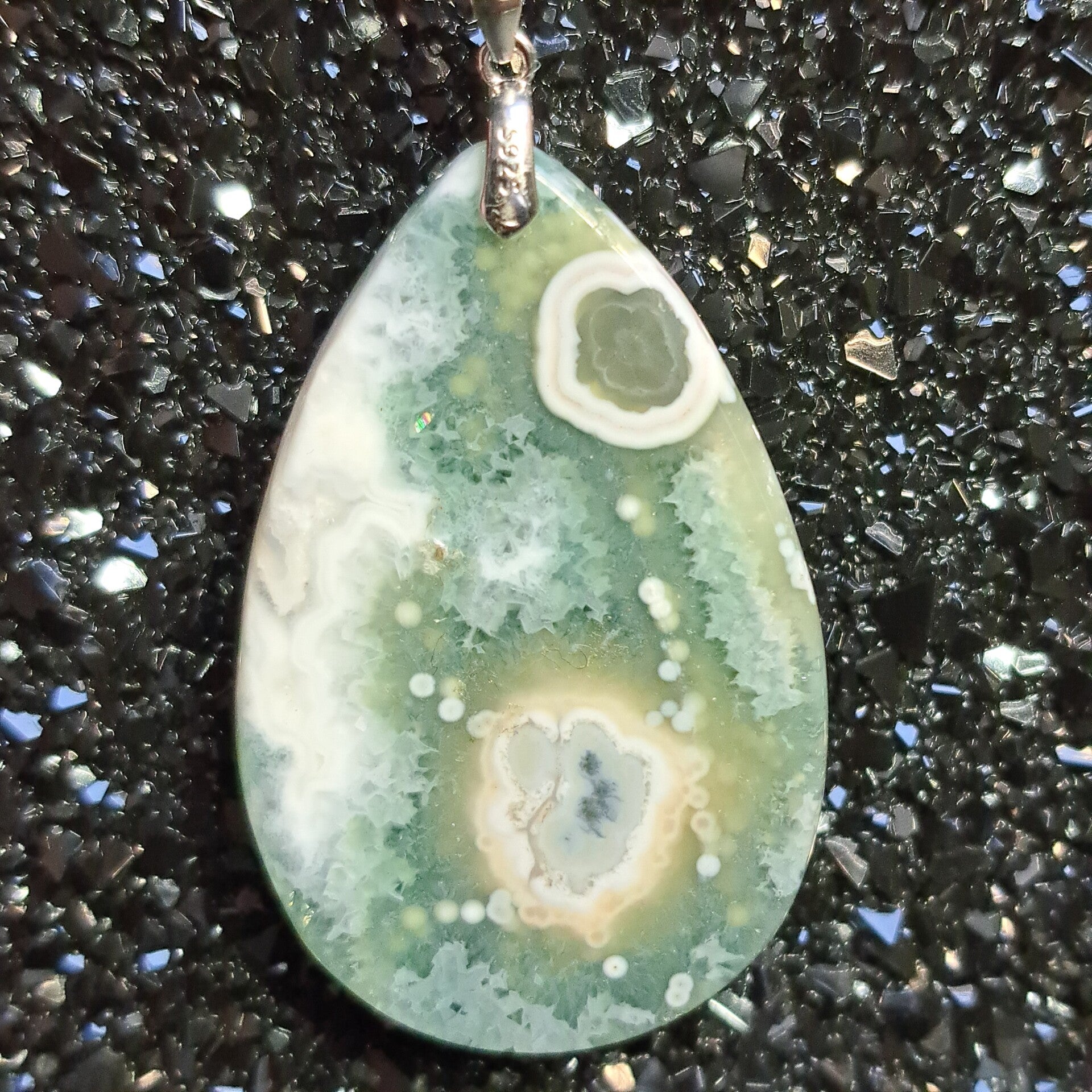 Prachtige hanger in hartvorm van zilver met steen van orbicuculaire 8th vein oceaanjaspis (De typische rondjes). De hanger is 5,3 cm groot.