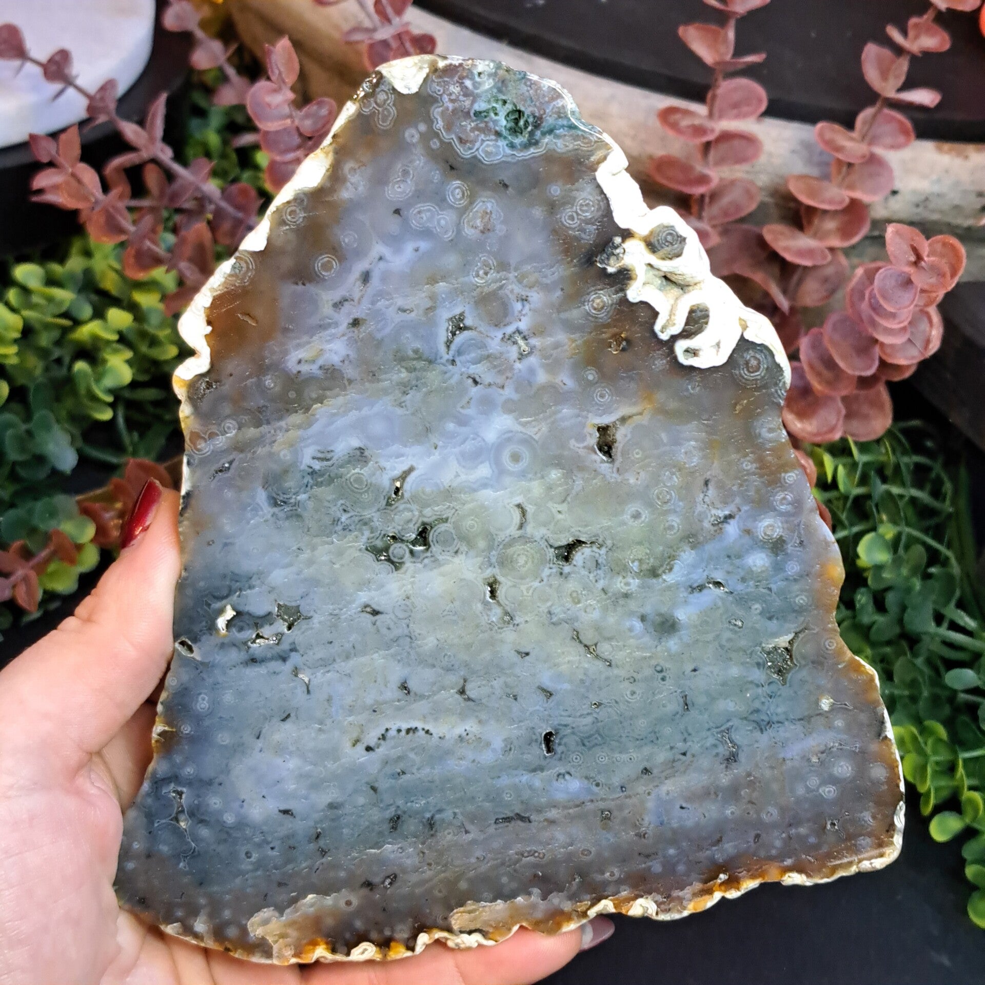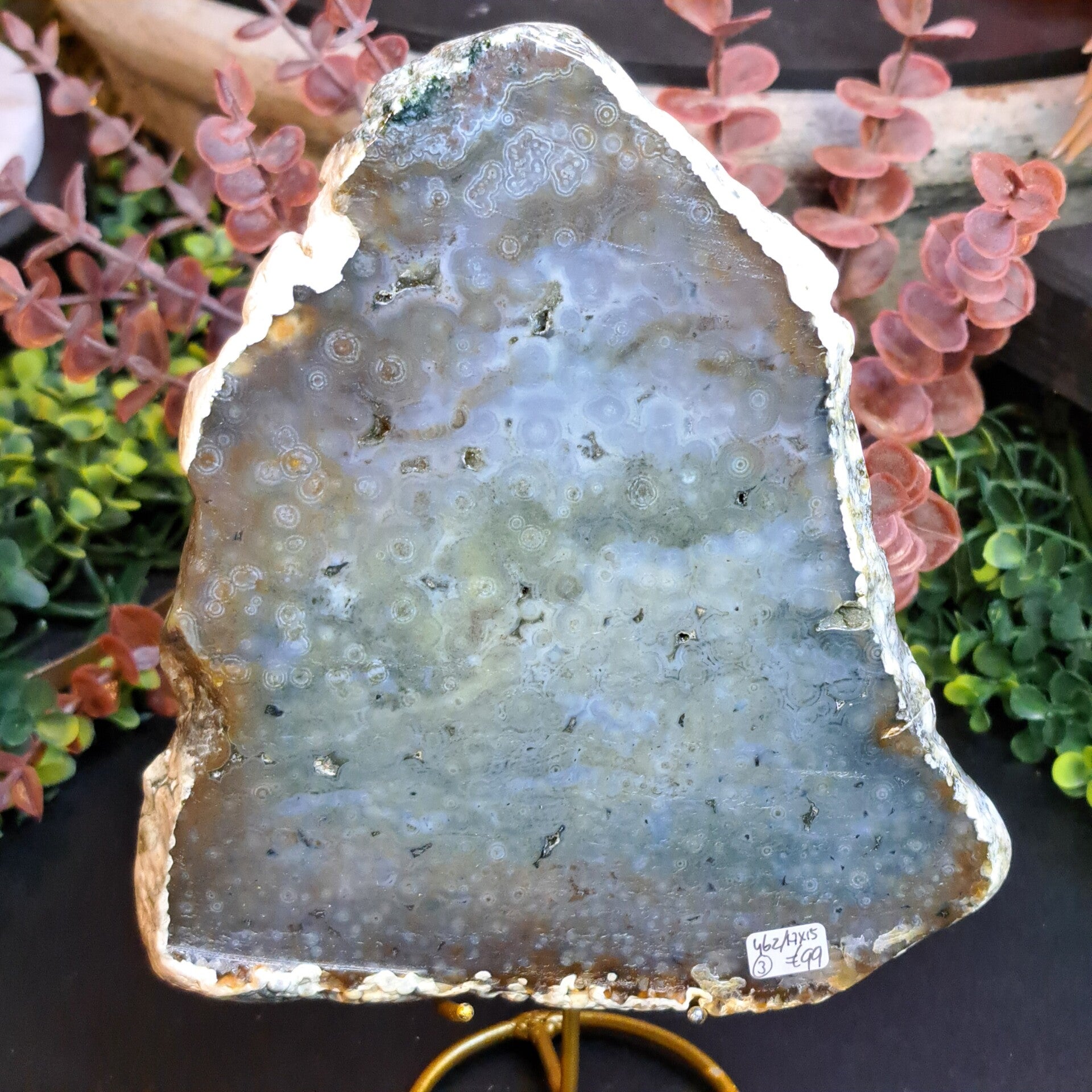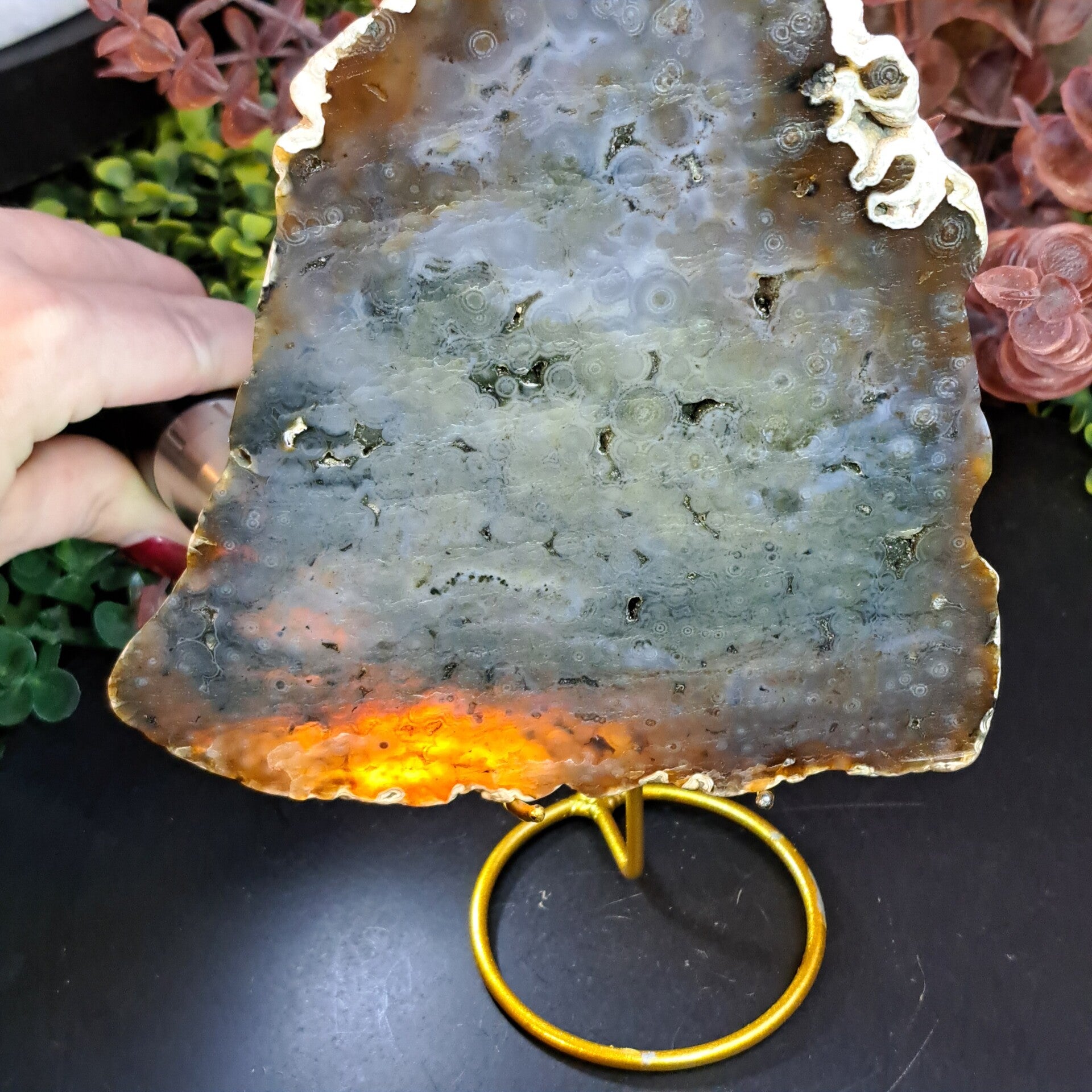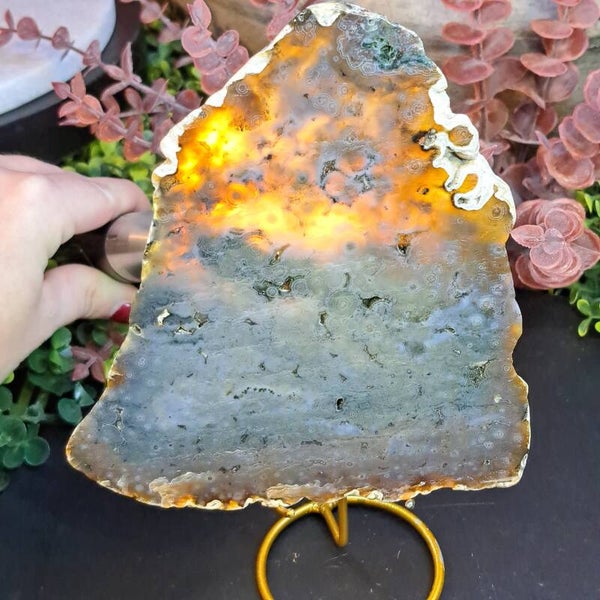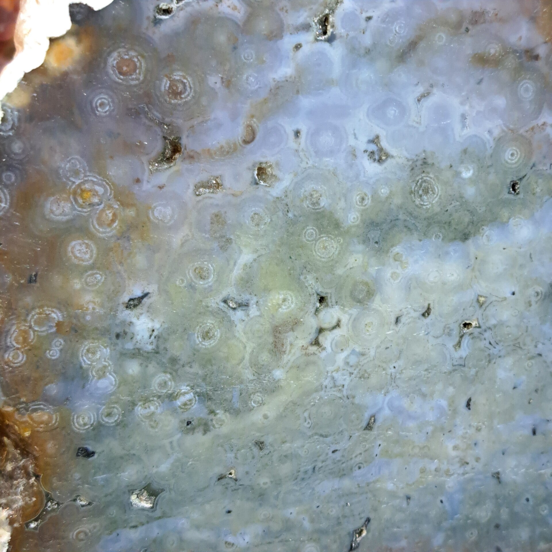 Weer zo´n mooi bijzonder exemplaar! Deze Oceaanjaspis zit vol met het typische stipjes lijnenspel en wat prachtige glimmende chalcedoongrotjes en wanneer je er een lichtje achter plaatst zit het chalcedoon vol vuur!